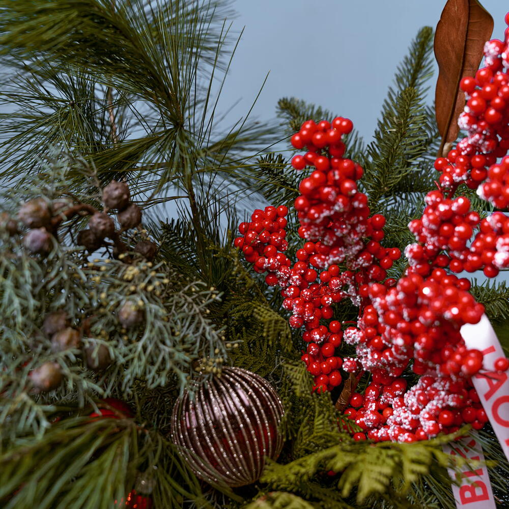 Праздничная новогодняя композиция в красной палитре, объединившая хвою, ягоды и яркие декоративные элементы. Яркий акцент для зимнего декора.