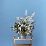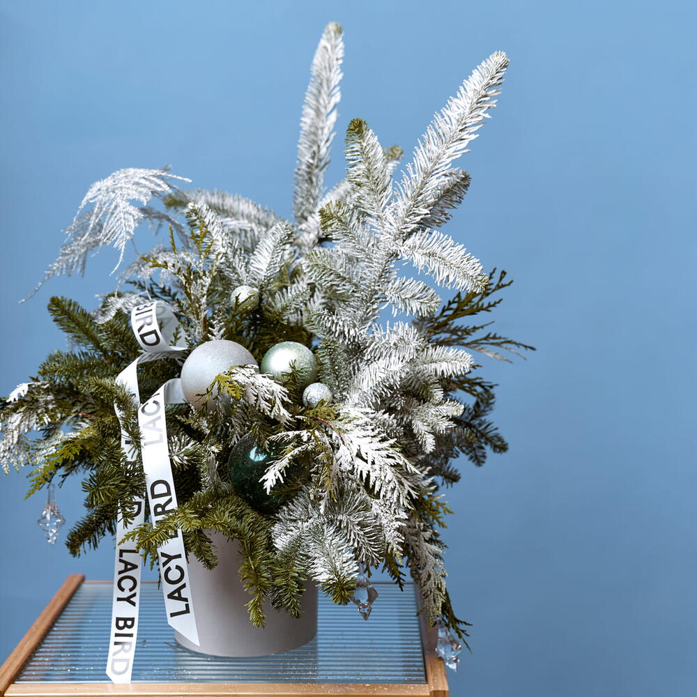 Нежная новогодняя композиция, выполненная в спокойных, светлых оттенках. Лёгкая хвоя, деликатные декоративные элементы и аккуратные акценты создают утончённую и тёплую атмосферу зимнего праздника.