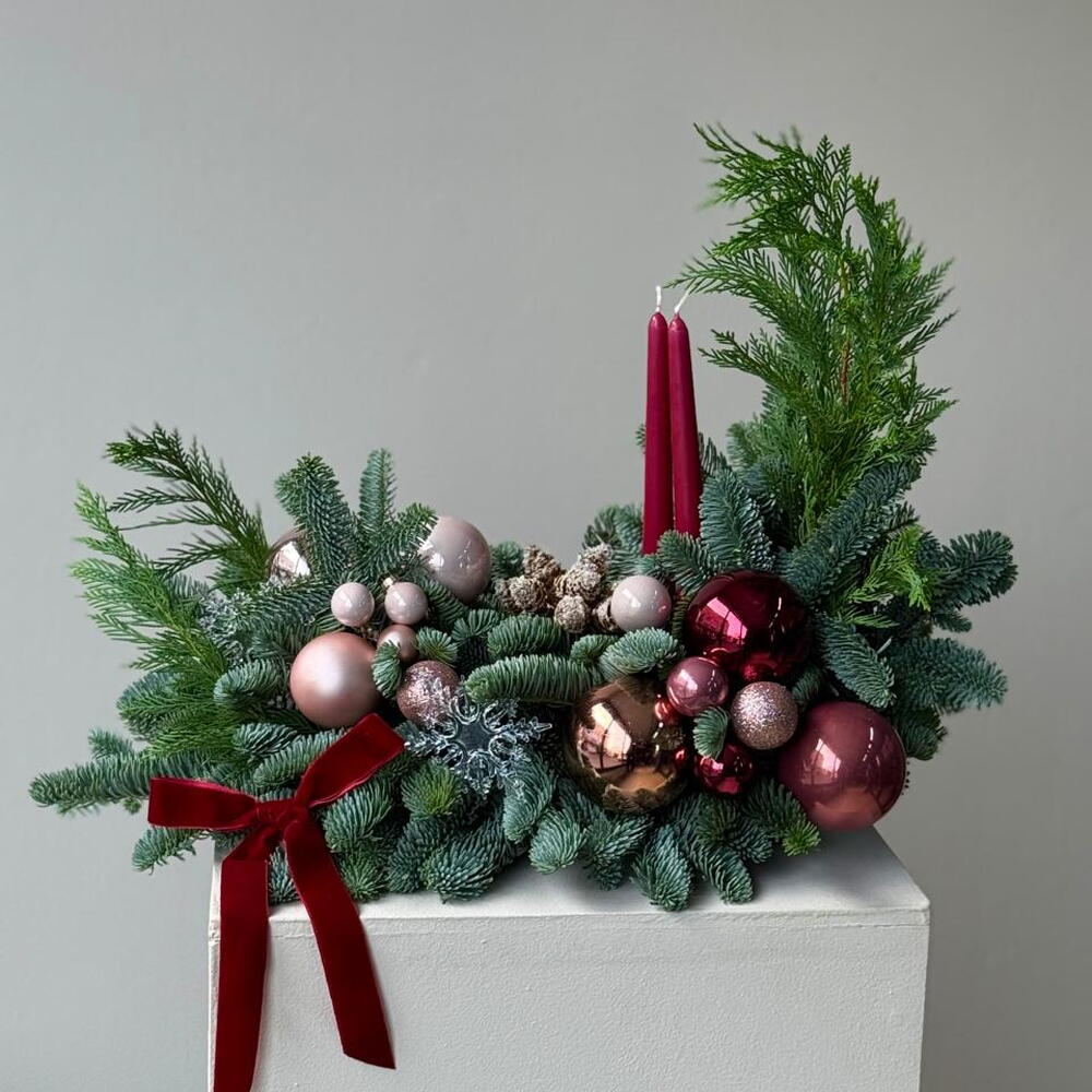Лента бархатная - 1 дана Нобилис - 2 дана Игрушки елочные - 19 дана снежинка декор - 2 дана шишки декоративные - 1 дана туя натуральная - 2 дана свечи немецкие - 2 дана