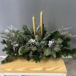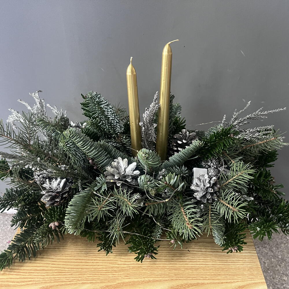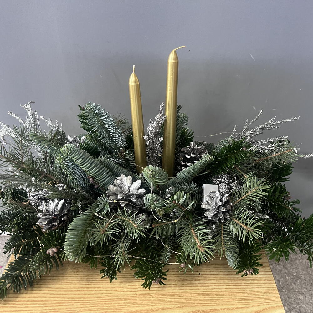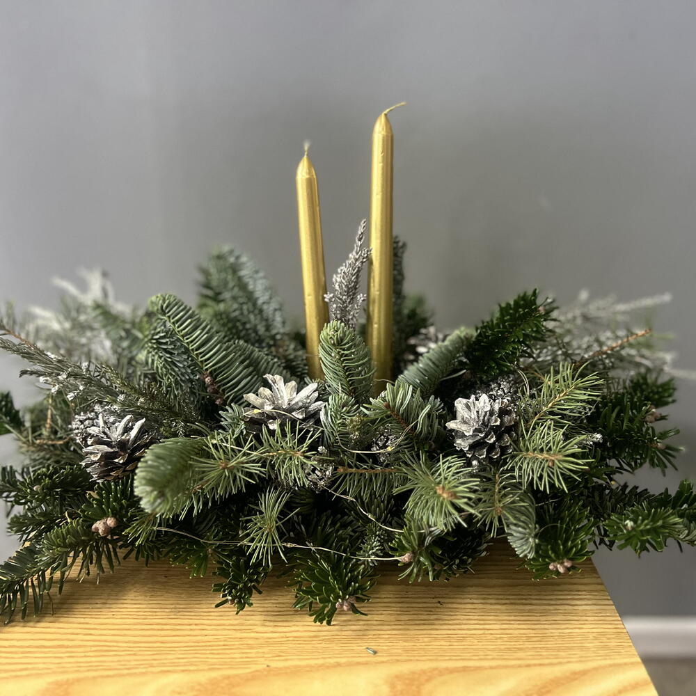 Үстел үстіндегі жаңа жылдық нобилилер мен шамдардан жасалған композиция қысқы кештің жайлылығын жасыл желектермен бейнелейді. Қарағайдың хош иісі үйді мерекелік сезімге бөлейді, ал жылы шам жарығы тыныштық пен ғажайыпты күтуді оятады. Бұл жай ғана декор емес, Жаңа жылдың тыныш, жылы сәті.