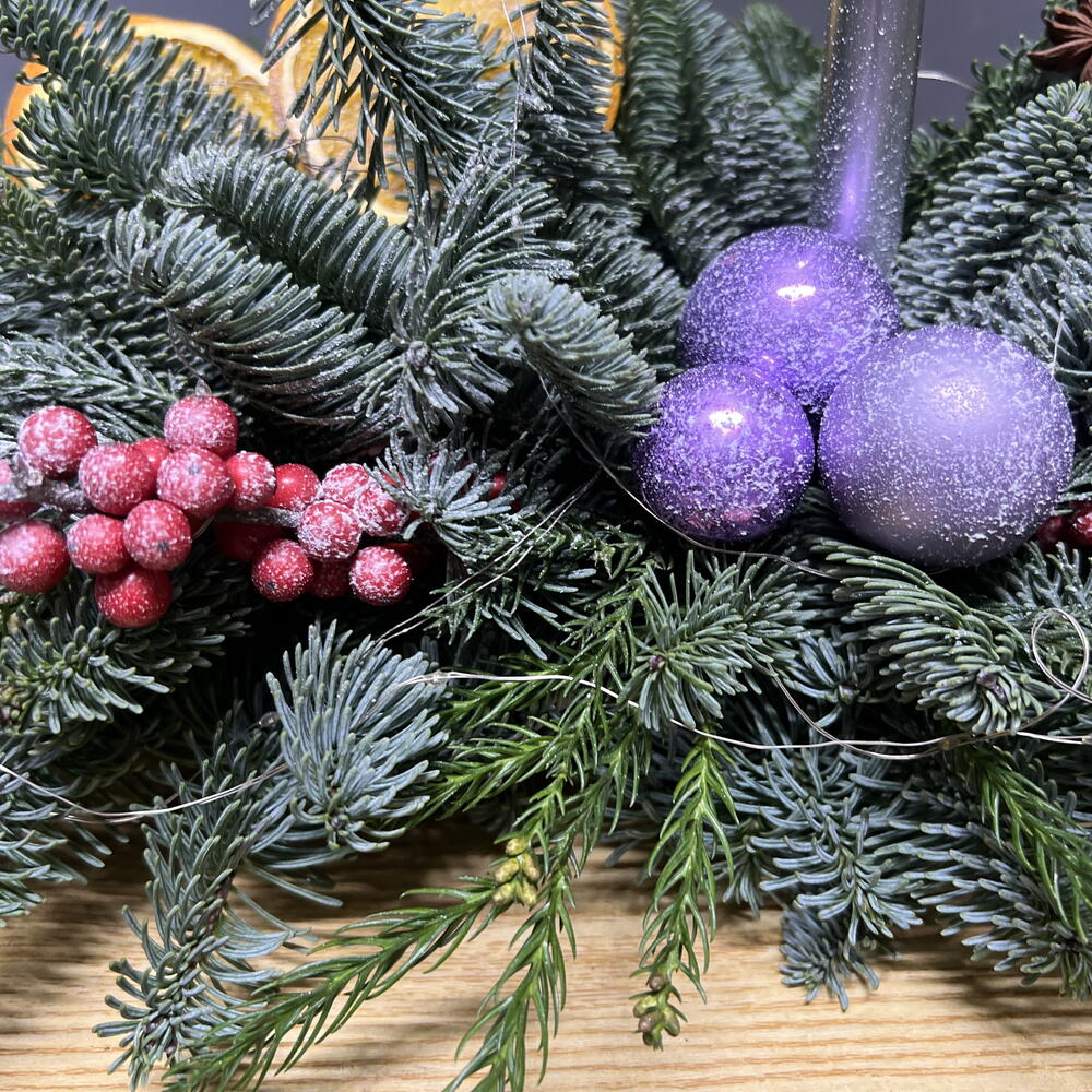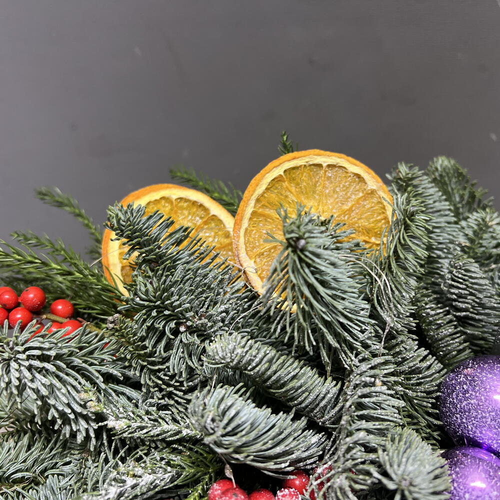Илекс - 1 дана Нобилис - 1 дана Жаңа жылдық шам - 1 дана Шырша ойыншықтары - 3 дана апельсин тілімдері - 2 дана жарықдиодты жолақ - 1 дана