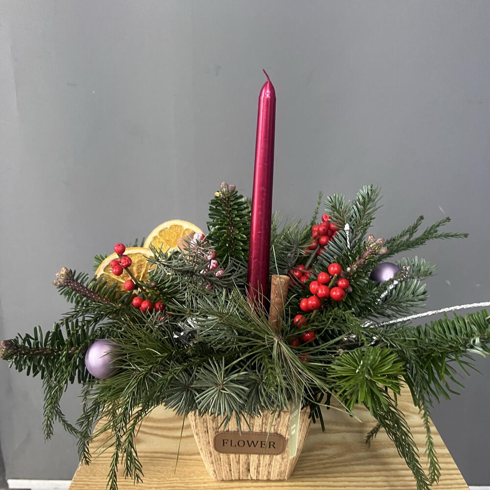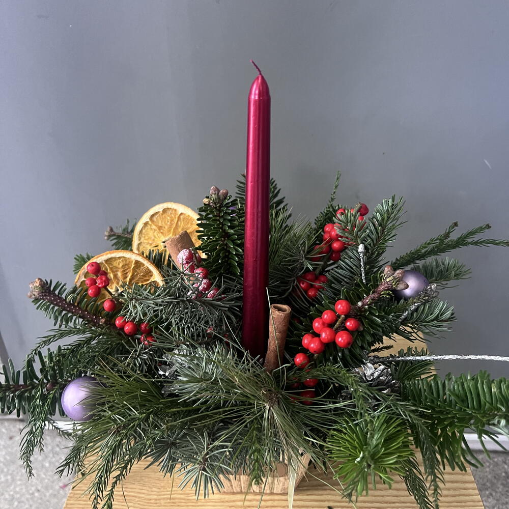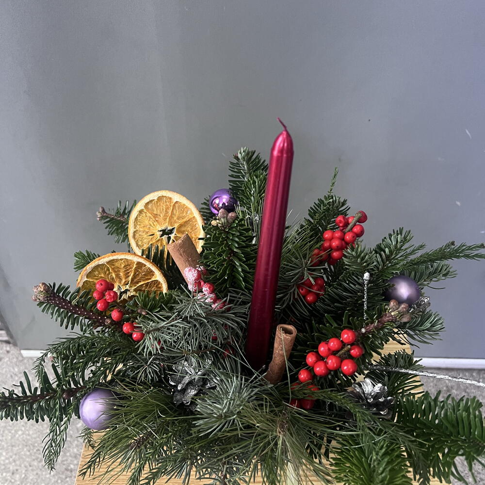 Илекс - 1 дана Нобилис - 1 дана Жаңа жылдық шам - 1 дана Шырша ойыншықтары - 2 дана апельсин тілімдері - 2 дана