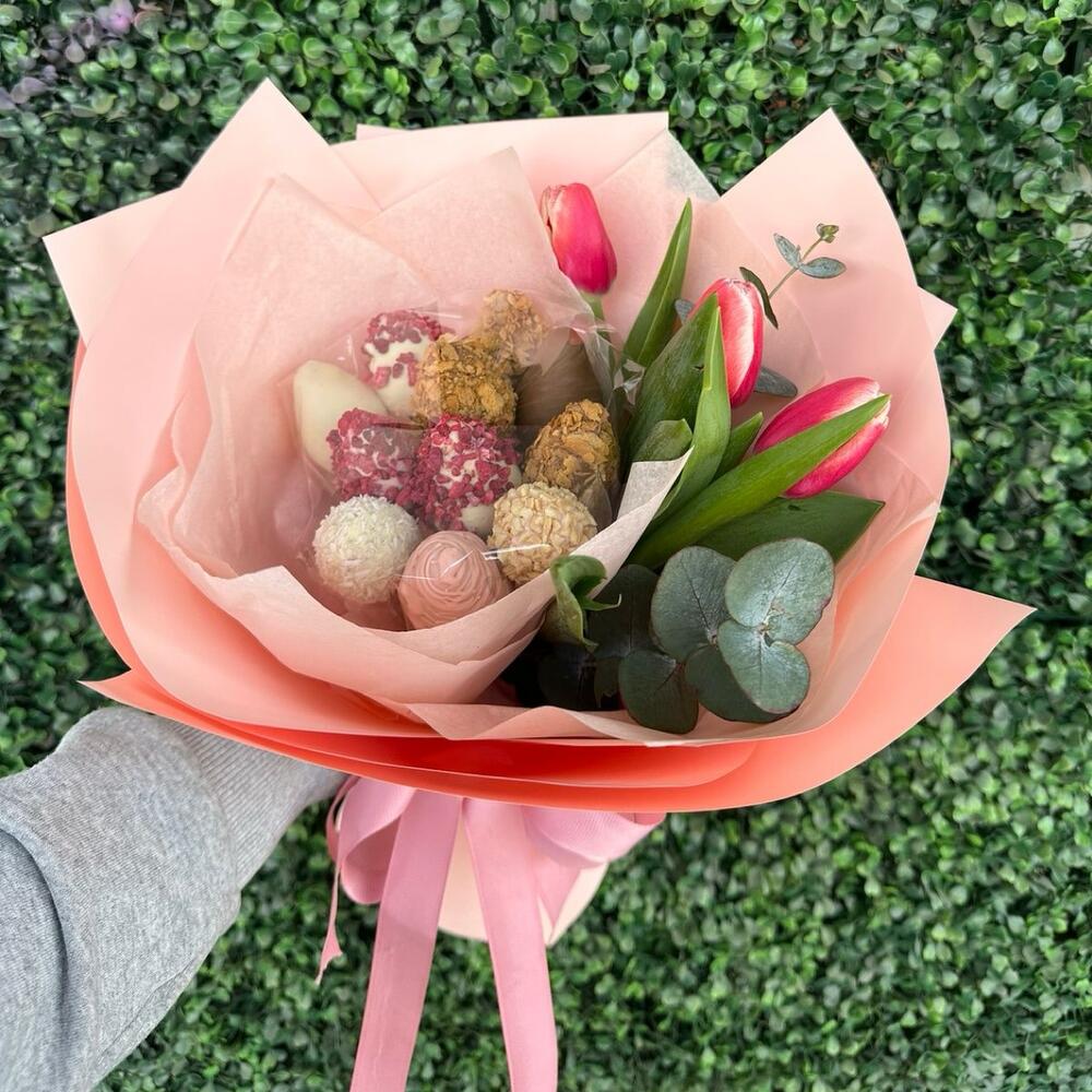 Тюльпан - 3 дана Эвкалипт - 2 дана Шоколадтағы құлпынай - 11 дана