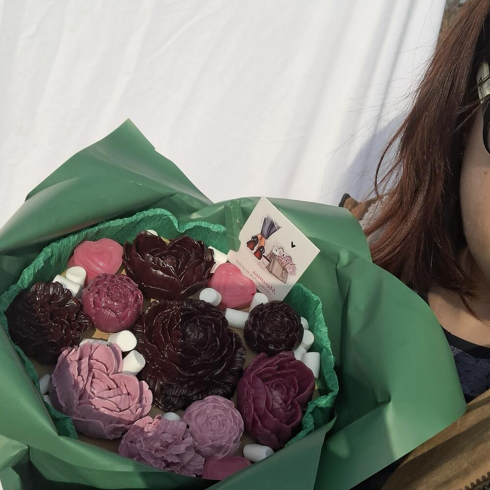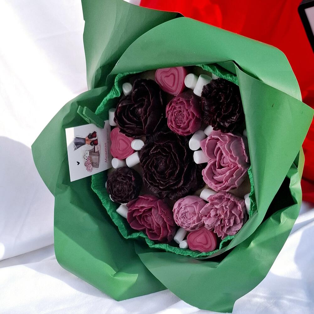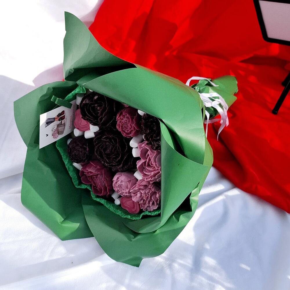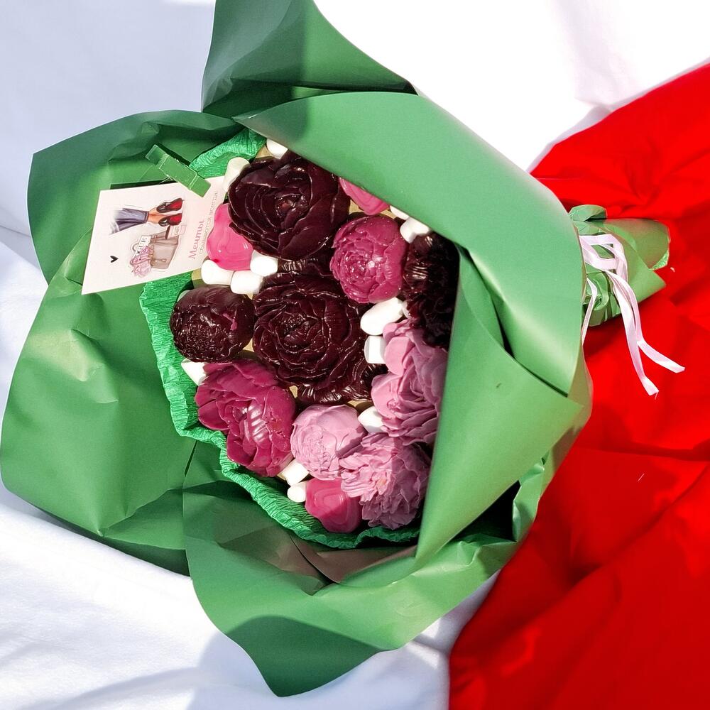 Букет из Бельгийского пластичного белого шоколада. С 5 начинками: орео, сникерс, рафаэло, баунти, арахисовая паста с морской солью.