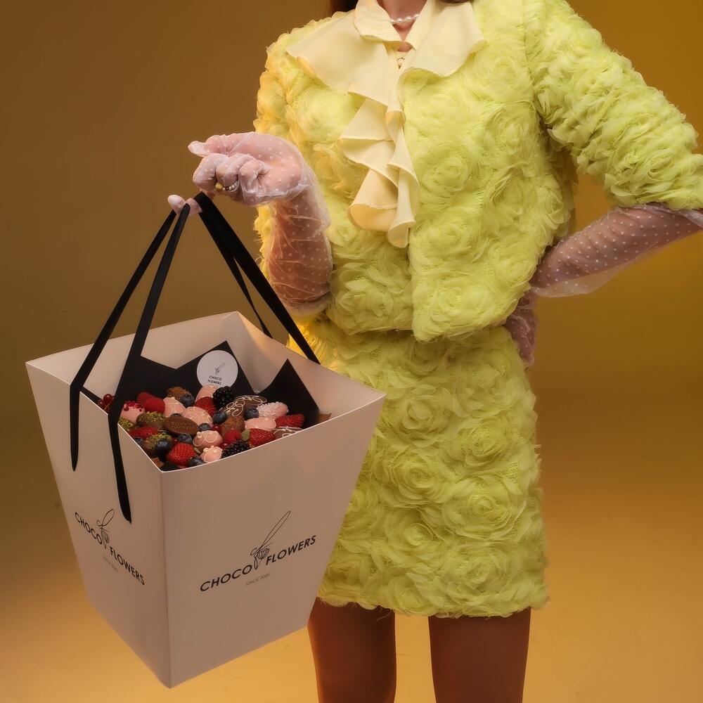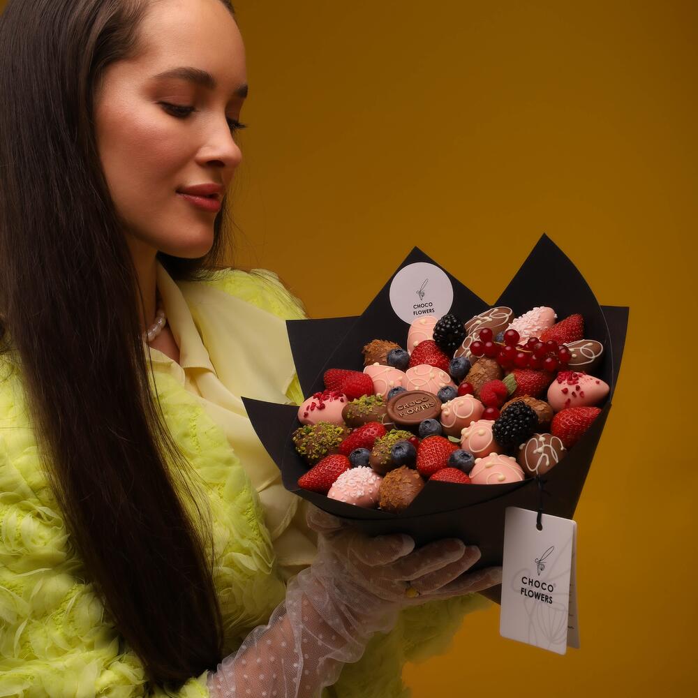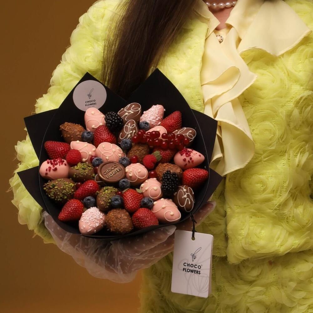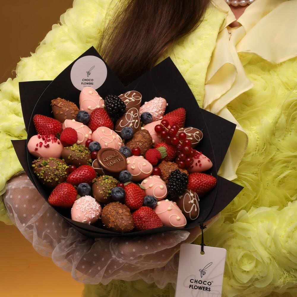 Шоколад ручной работы - 1 дана свежая клубника - 8 дана свежая малина - 45 гр. свежая голубика - 45 гр. свежая ежевика - 45 гр. свежая ветка красной смородины - 1 дана клубника в молочном и розовом шоколаде - 22 дана