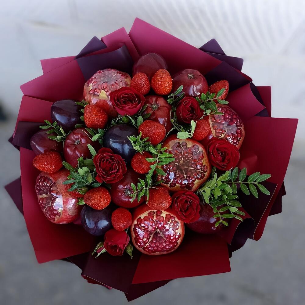 Құлпынай - 11 дана Бұта раушаны - 7 дана Гранат - 5 дана Яблоко - 5 дана Слива - 7 дана Дизайнерлік қаптама - 2 дана зелень фисташки - 5 дана