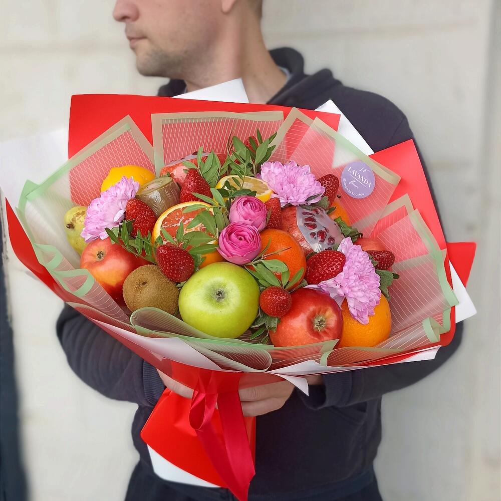 Құлпынай - 9 дана Зелень - 5 дана Орау - 2 дана Гранат - 2 дана Киви - 3 дана Апельсин - 2 дана Мандарин - 2 дана Лимон - 2 дана Груша - 1 дана цветы микс - 5 дана Яблоки - 4 дана