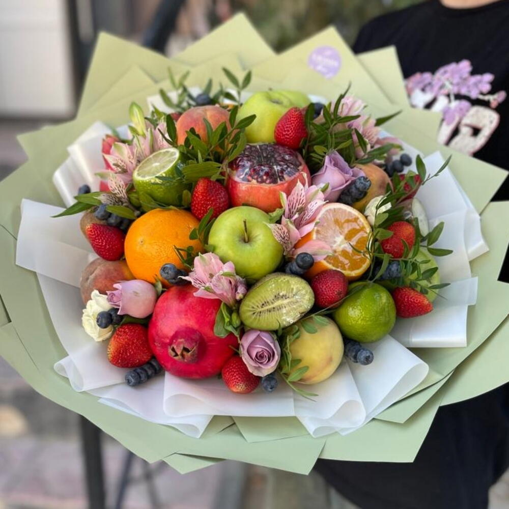 Альстроэмерия - 5 дана Құлпынай - 15 дана Раушан - 5 дана Гранат - 3 дана Киви - 3 дана Яблоко - 5 дана Апельсин - 3 дана Лайм - 2 дана Персик - 5 дана Дизайнерлік қаптама - 2 дана Жүзім - 100 гр. зелень фисташки - 7 дана