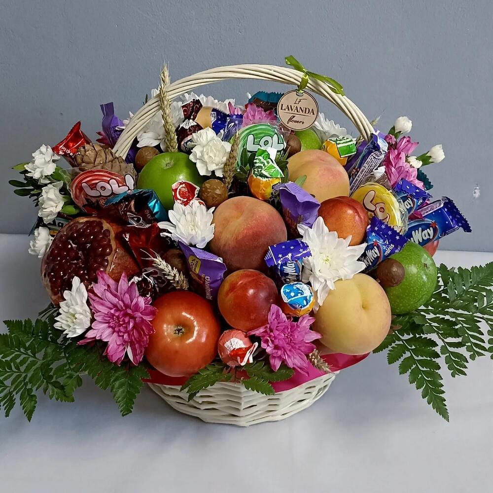 Корзина - 1 дана Хризантема бұтасы - 3 дана Гранат - 1 дана Яблоко - 5 дана Персик - 5 дана Диантус кустовой - 2 дана Гүлді губка - 2 дана Нектарин - 6 дана Шоколадные батончики - 10 дана зелень декоративная - 5 дана қабықтағы макадамия - 7 дана карамель на палочке - 10 дана кедровая шишка с орешками - 1 дана леденцы на палочке - 3 дана шоколад кит кат - 3 дана шоколад милки вэй - 3 дана шоколад милки вэй мини - 7 дана