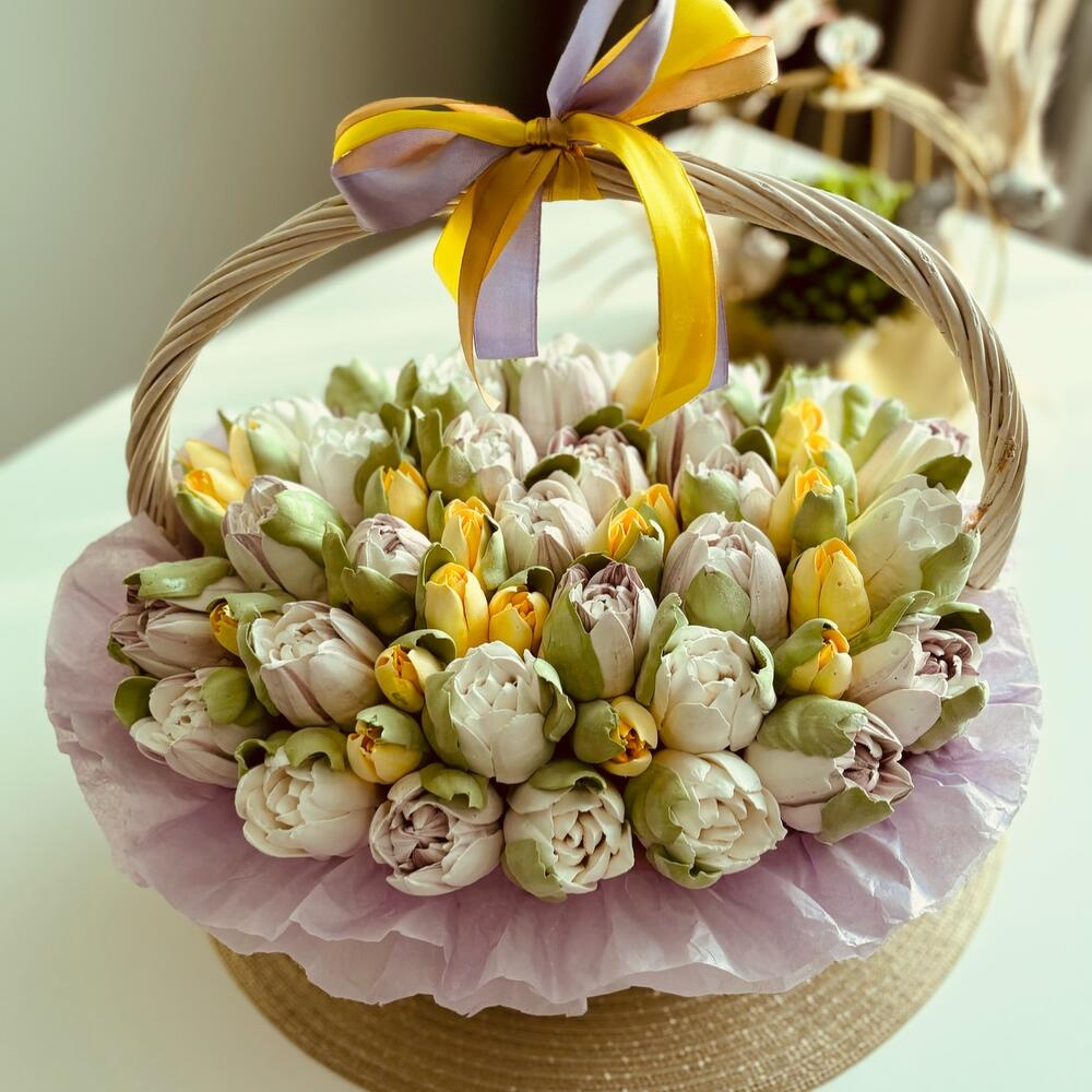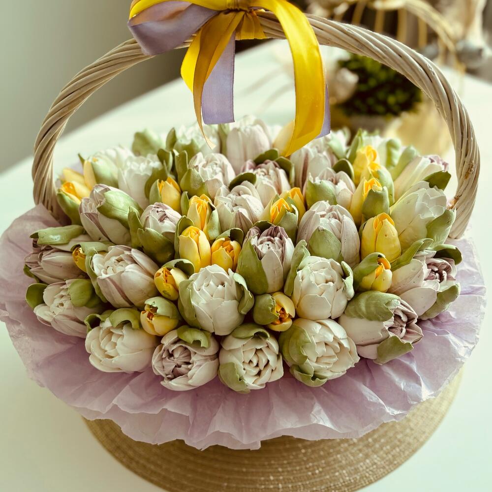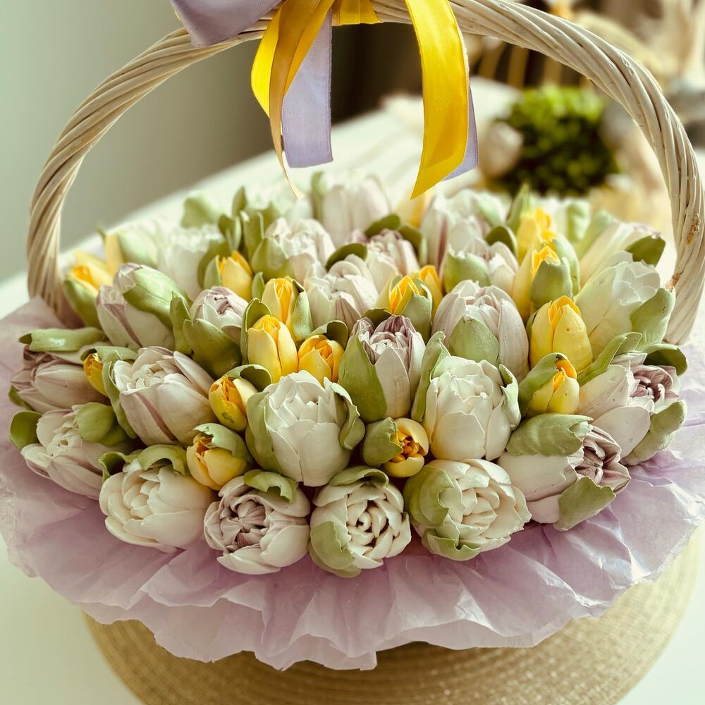 Корзина тюльпанов в любое время года - повод удивить и обрадовать даже самую взыскательную и требовательную натуру! Подарите зефирную корзину- это тот подарок, от которого захватывает дух! Состав: яичный белок пастеризованный, сахар, агар-агар, фруктовое пюре, лимонная кислота, пищевой краситель
