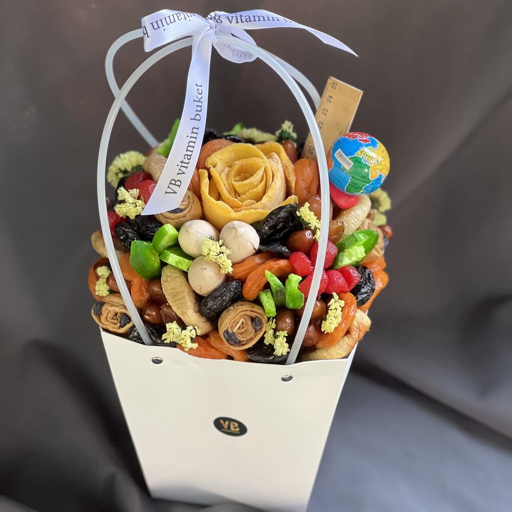 Курага - 150 гр. Чернослив - 150 гр. Вишня вяленая - 50 дана Финики - 150 гр. Инжир сушеный - 130 гр. Манго сушеный - 150 гр. памелло - 80 гр. пекан орех - 6 дана дыня хаштаг - 5 дана