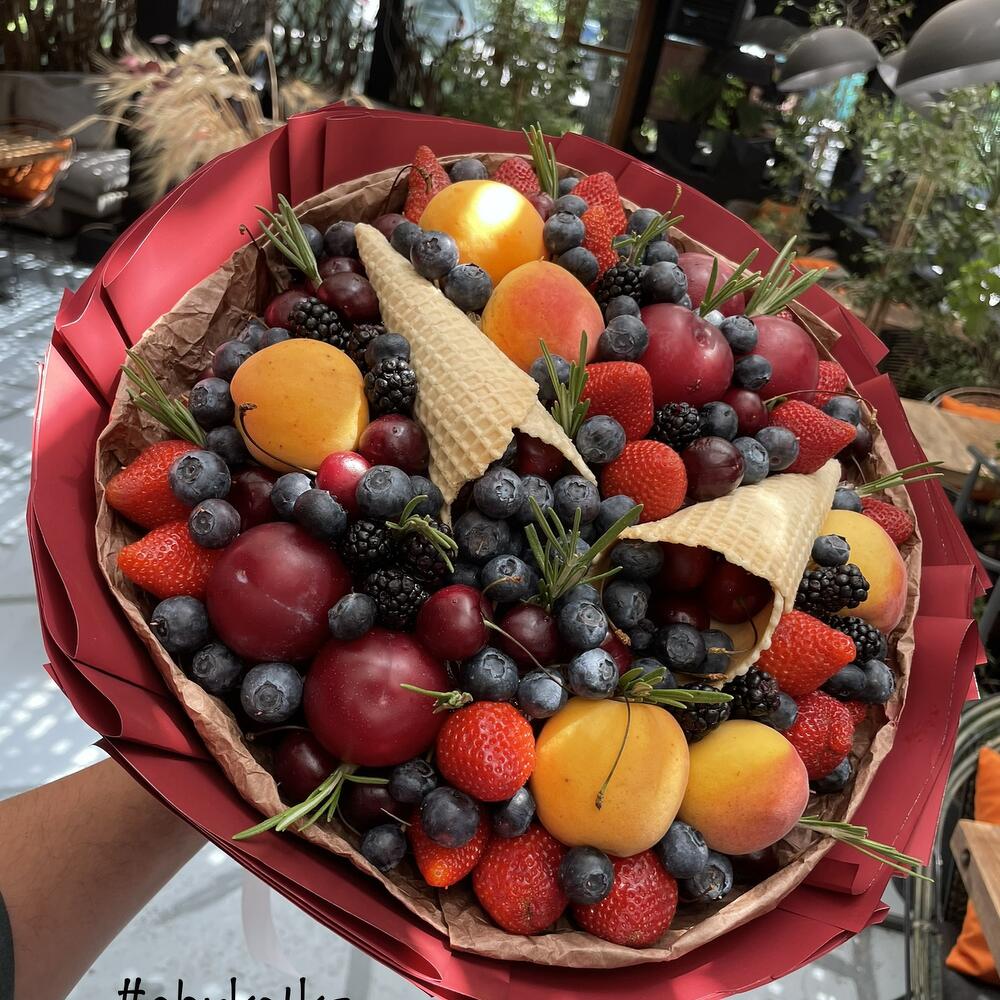 Құлпынай - 15 дана Слива - 5 дана Ежевика - 7 дана Жүзім - 25 дана Розмарин - 1 дана вафельные рожки - 2 дана
