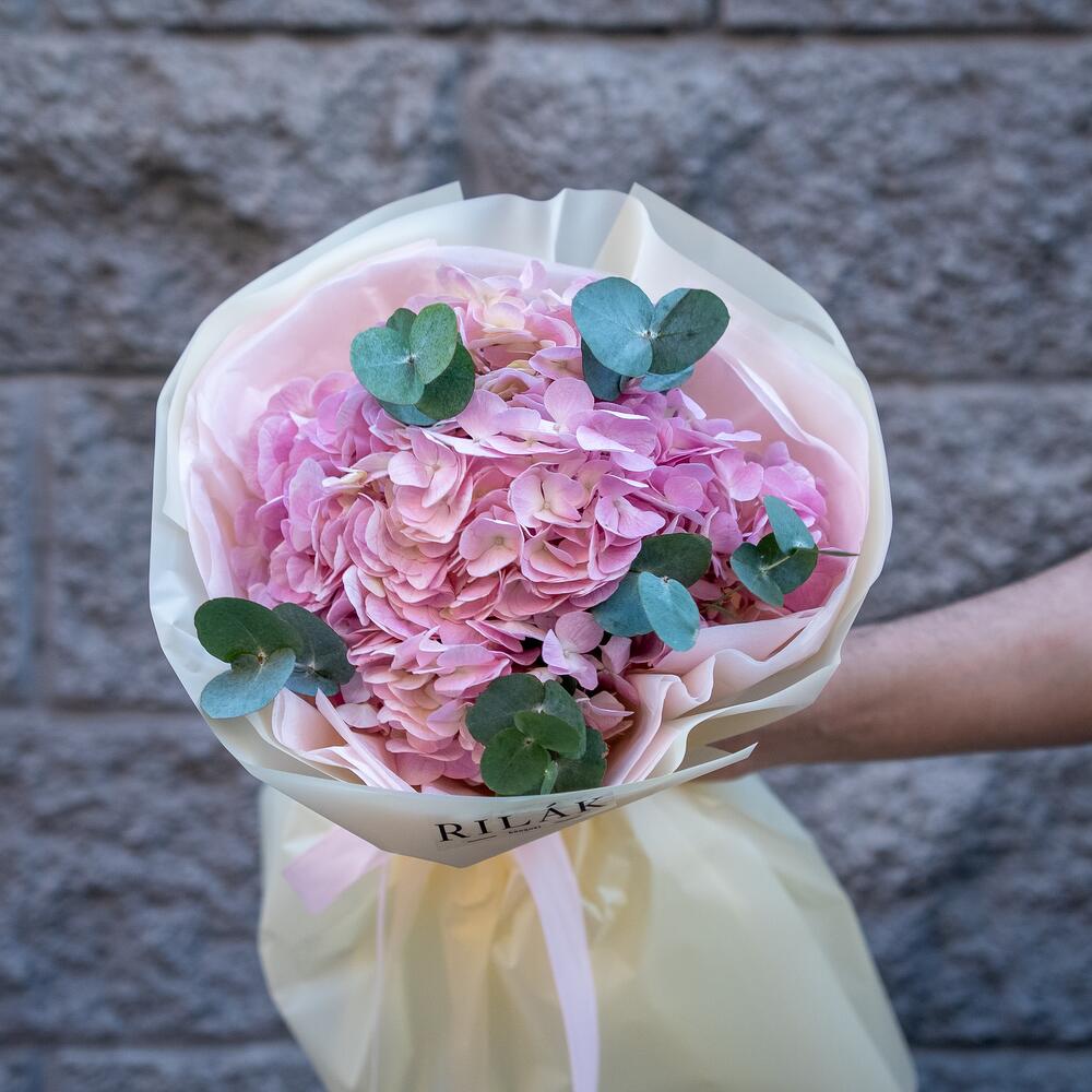 Роскошная розовая королевская гортензия с добавлением эвкалипта в пышном и объёмном оформлении.
