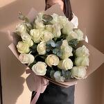 25 белых роз с эвкалиптом