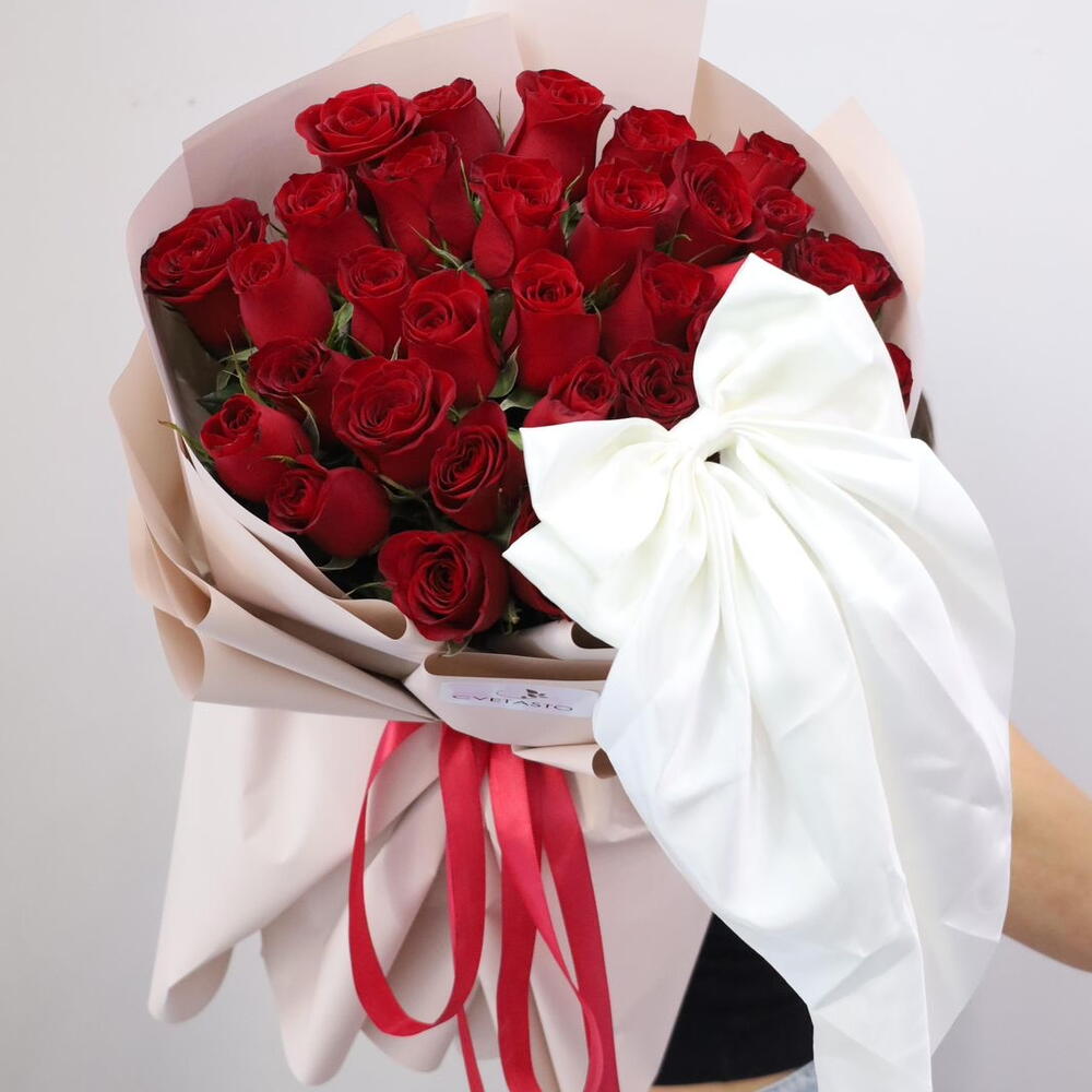 35 биік қызыл раушан бантикпен