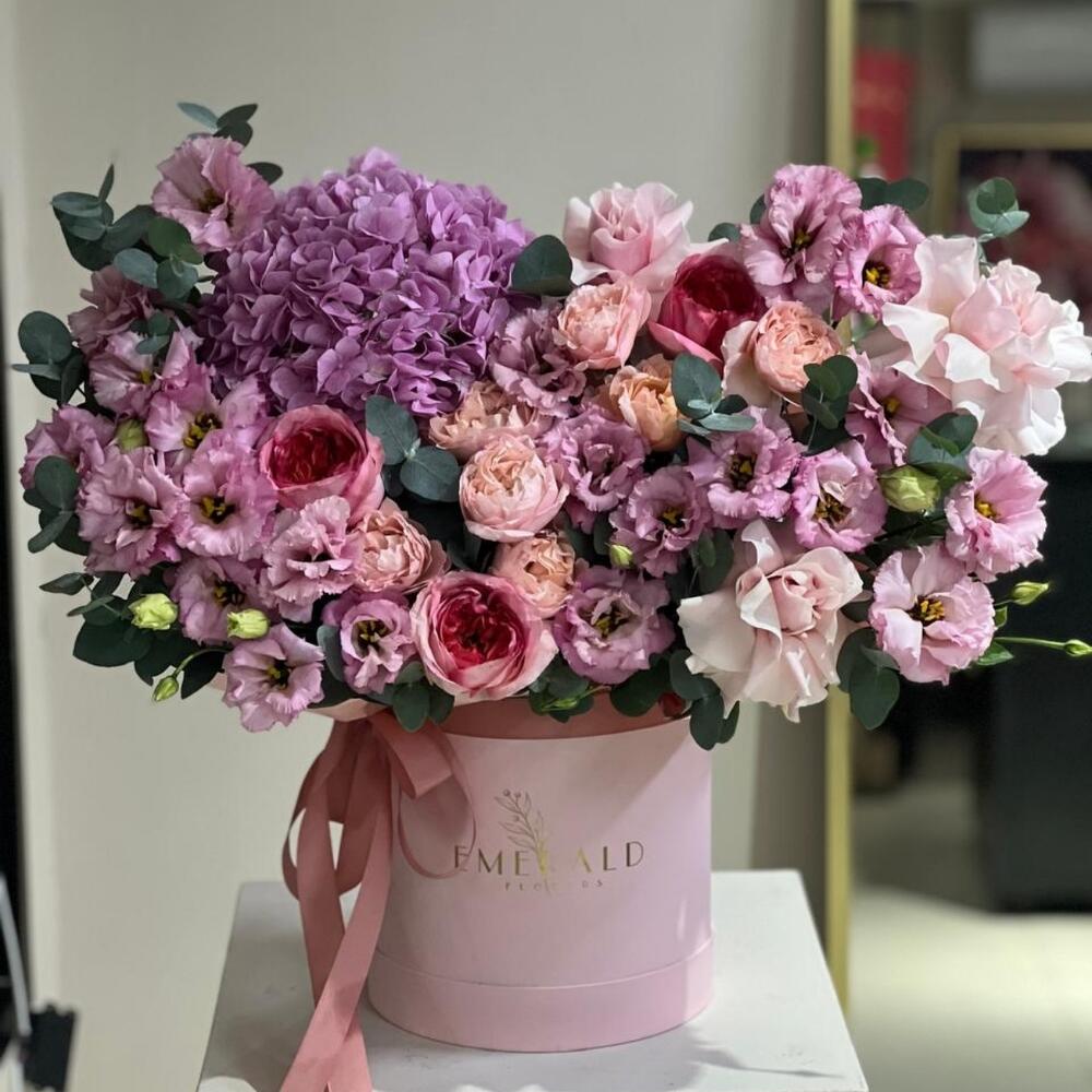 эустома розовая - 5 дана Қызғылт Гортензия - 1 дана Эвкалипт пучок - 1 дана Брендированная коробка - 1 дана джульетта кустовая роза пионовидная - 2 дана пинк мондиаль роза - 3 дана пионовидные розы - 3 дана