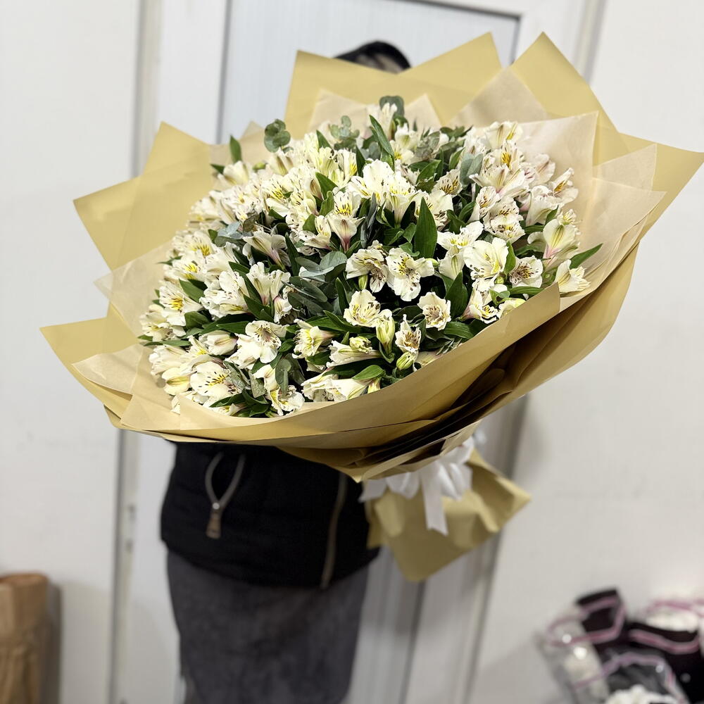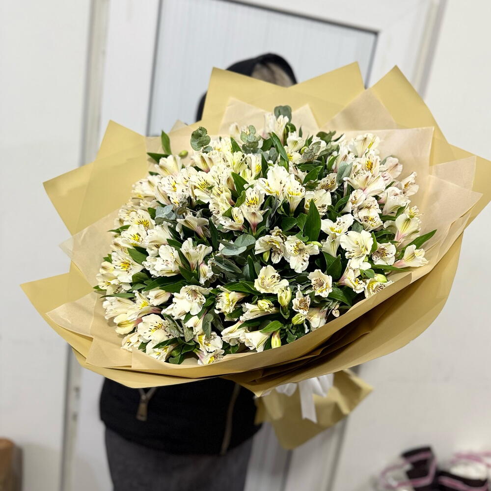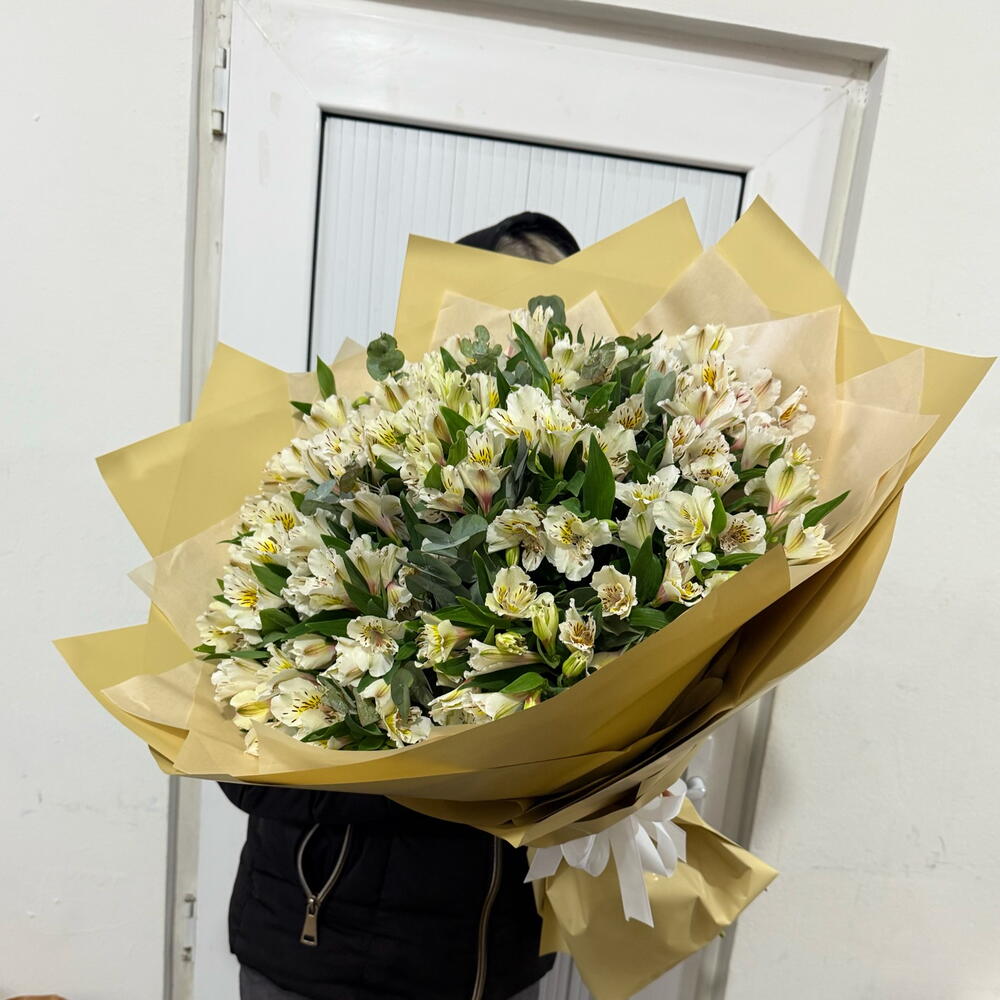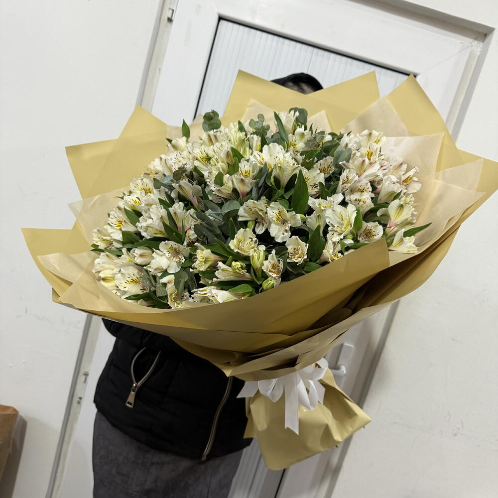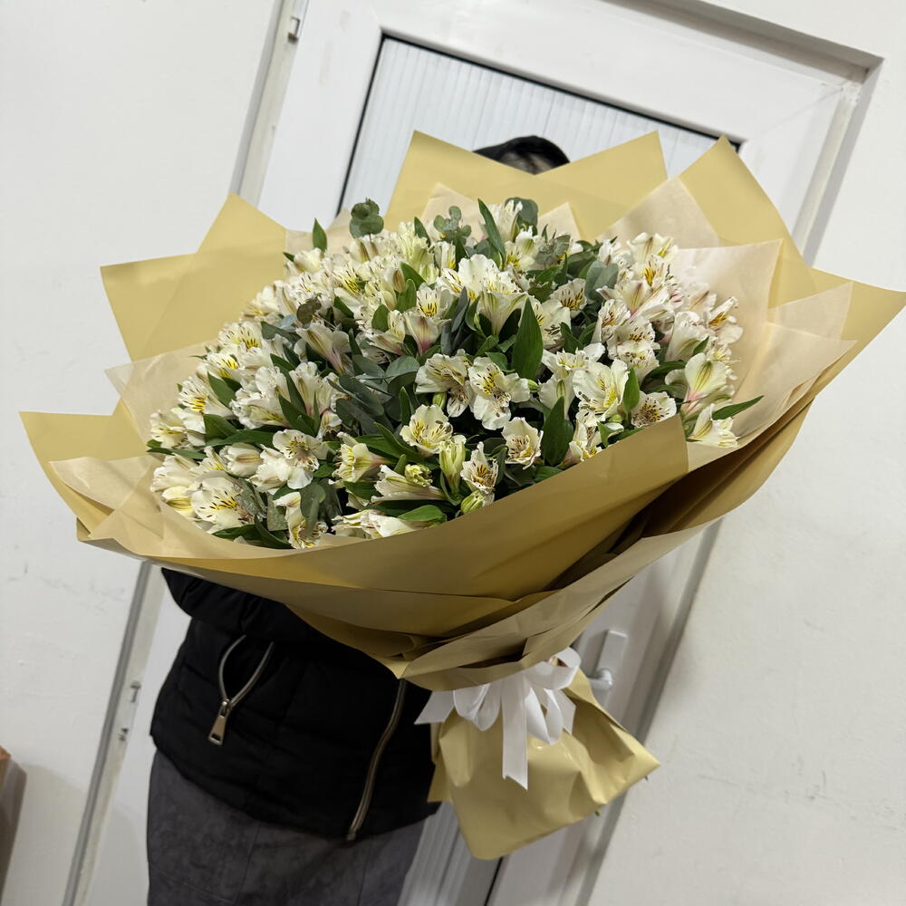 Атласты таспа - 1 дана Крафт қағаз - 6 дана ақ альстромерия - 19 дана