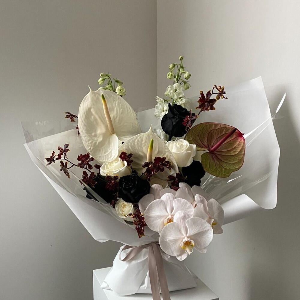 Антуриум - 3 дана Орхидея Фаленопсис - 1 дана Бұта раушаны - 4 дана Раушан - 3 дана экзотическая зелень - 4 дана дельфиниум или схожий высокий цветок - 2 дана антуриум (лист) - 1 дана