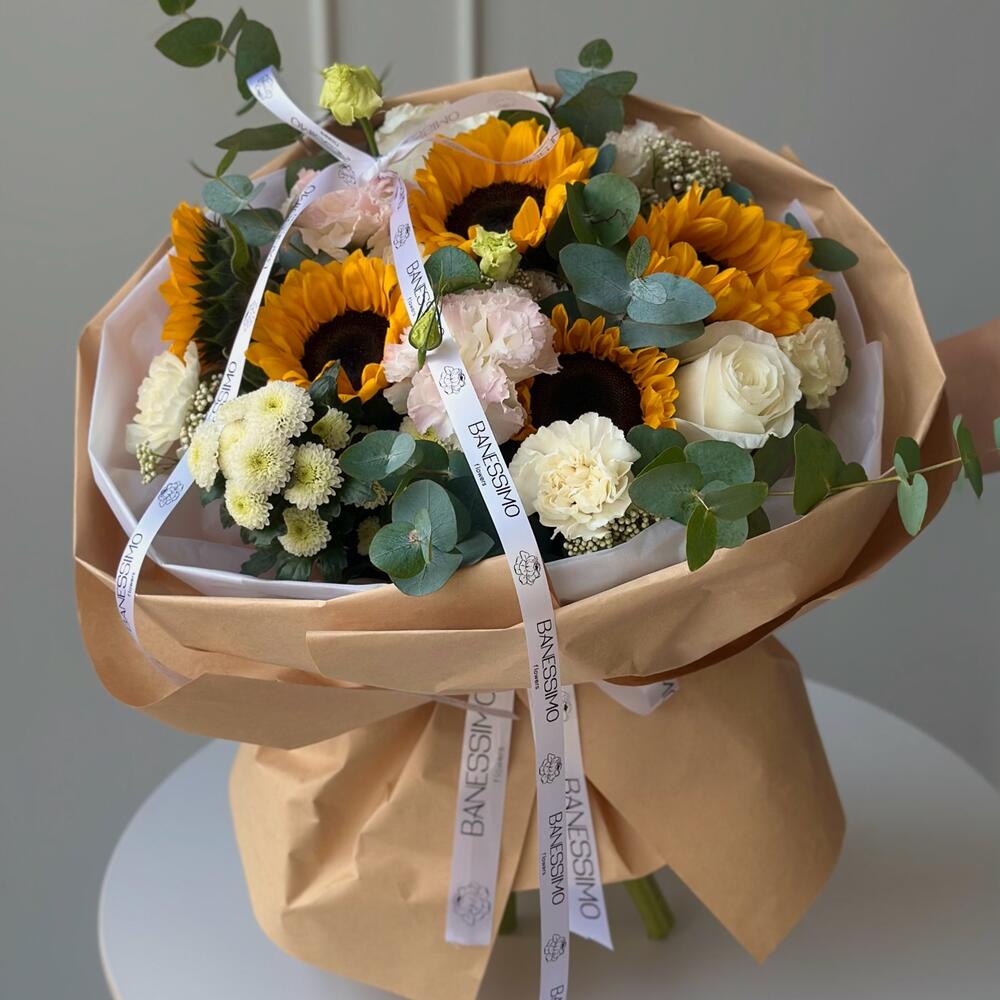 Лизиантус - 5 дана Озотамнус - 4 дана Раушан - 3 дана Гвоздика - 3 дана Подсолнух - 5 дана Сантини - 1 дана Эвкалипт Цинерея - 2 дана