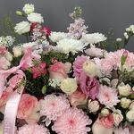 Эустома - 4 дана Маттиола - 3 дана Бұта раушаны - 3 дана Статица - 1 дана Раушан - 7 дана Хризантема - 4 дана Гүл құмырасы - 1 дана Бұтақты гвоздика - 5 дана Флористикалық Оазис - 2 дана липидиум - 2 дана