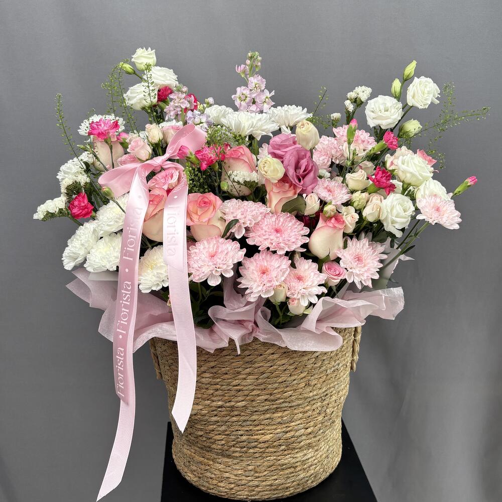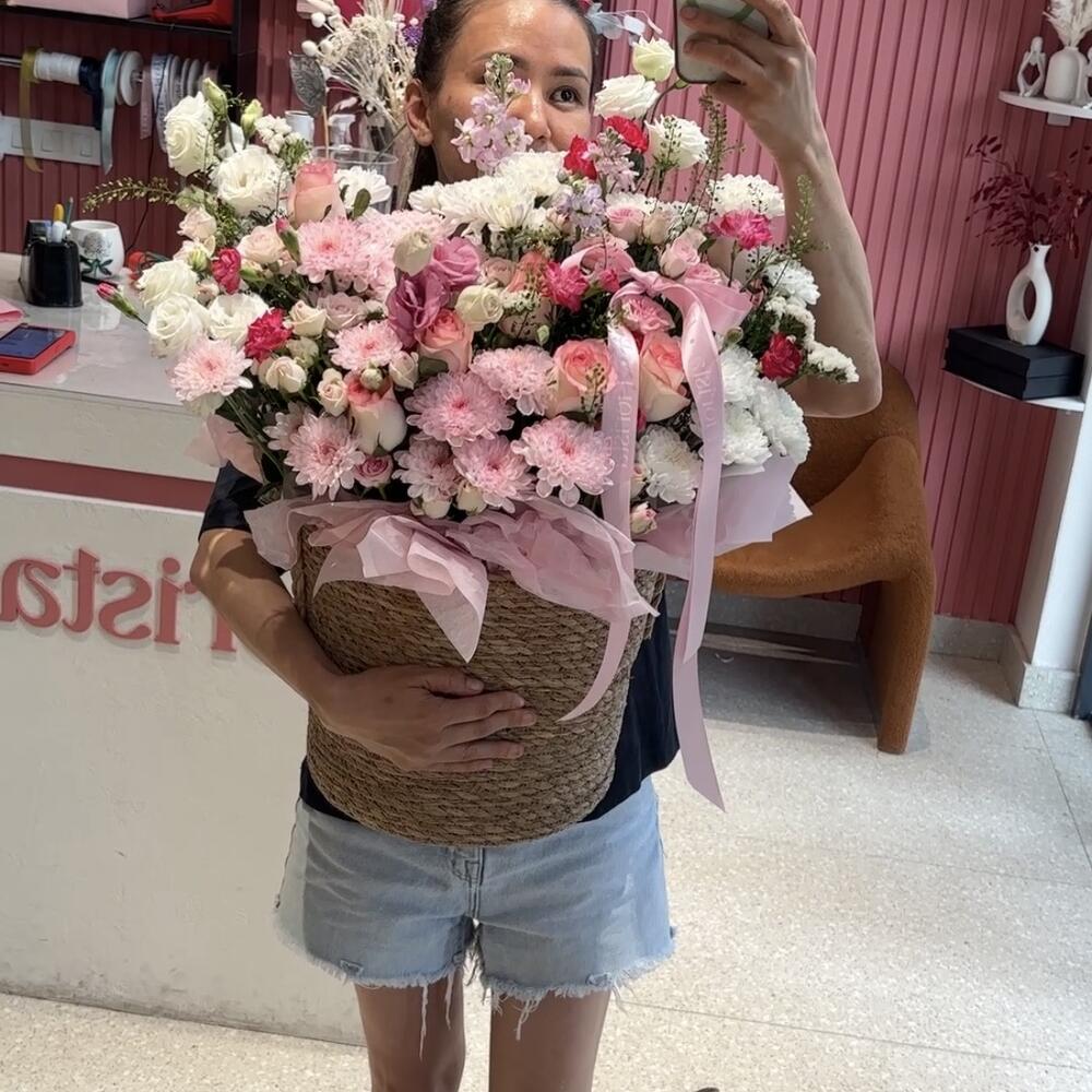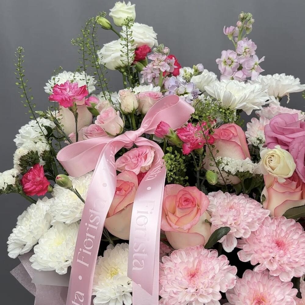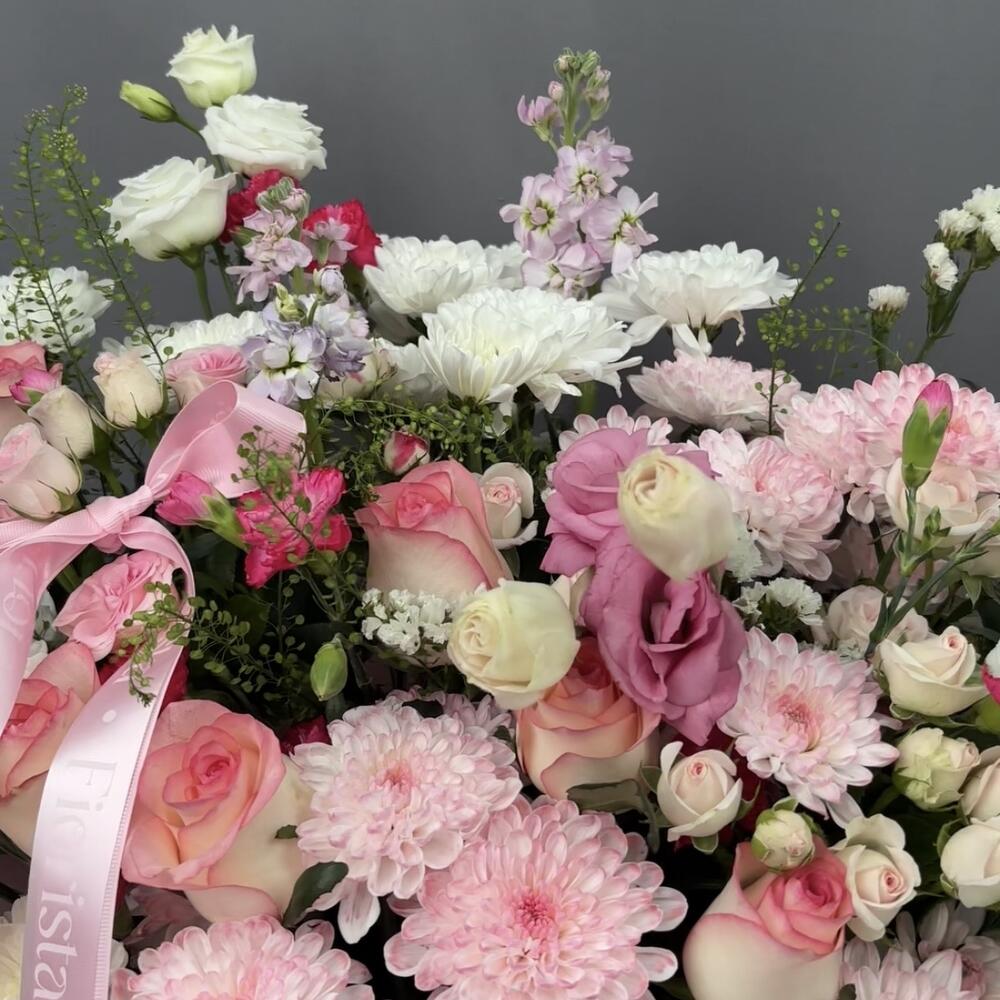 Эустома - 4 дана Маттиола - 3 дана Бұта раушаны - 3 дана Статица - 1 дана Раушан - 7 дана Хризантема - 4 дана Гүл құмырасы - 1 дана Бұтақты гвоздика - 5 дана Флористикалық Оазис - 2 дана липидиум - 2 дана