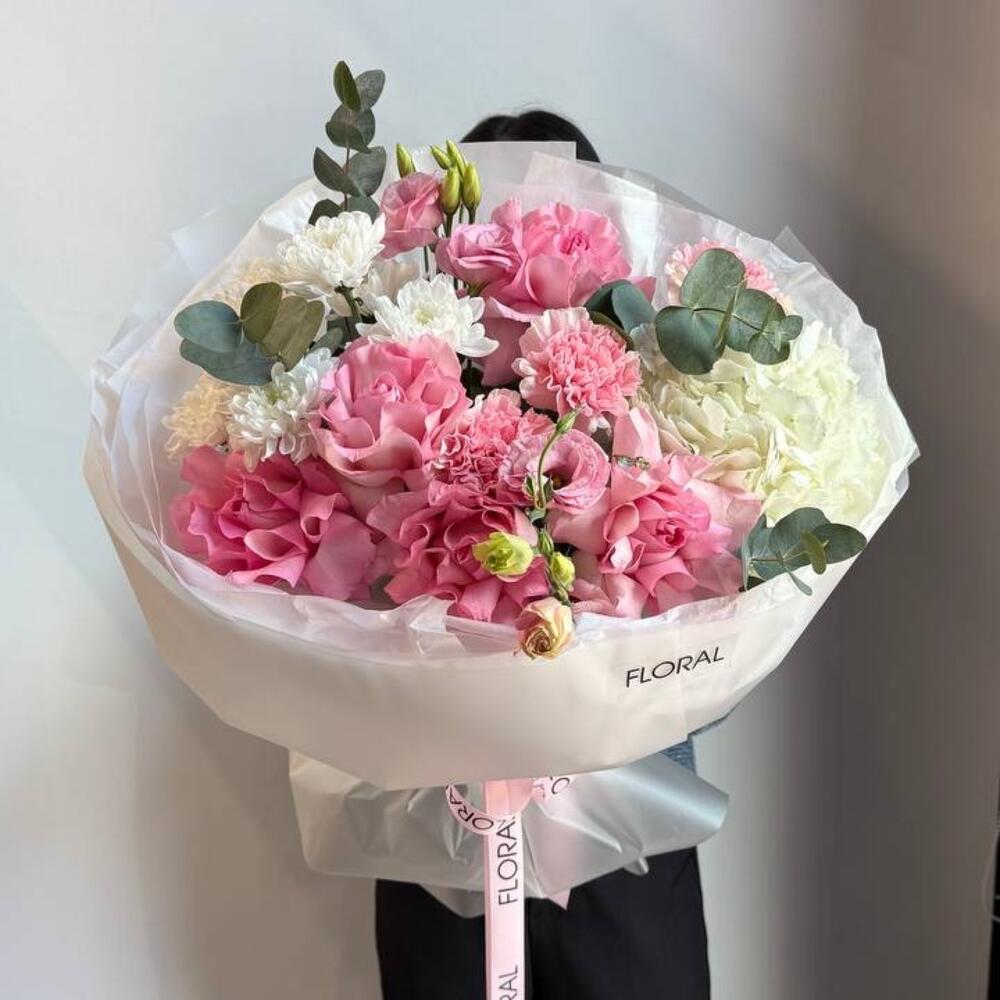 Этот авторский букет воплощает собой нежность и изысканность. В его состав входит царственная гортензия, утонченная лизиантус, экзотический эвкалипт, а также пять бархатных роз, три шедевральные гвоздики и одна эксклюзивная хризантема премиум. Сочетание этих цветов создаёт уникальную гармонию, делая букет идеальным подарком для ценителей классической элегантности.
