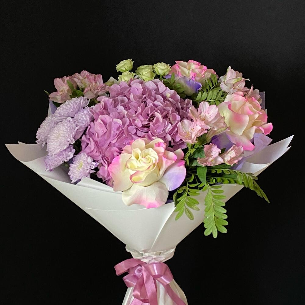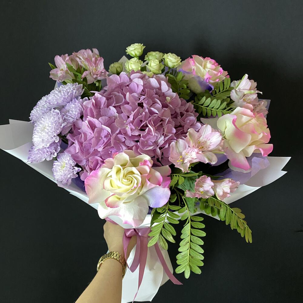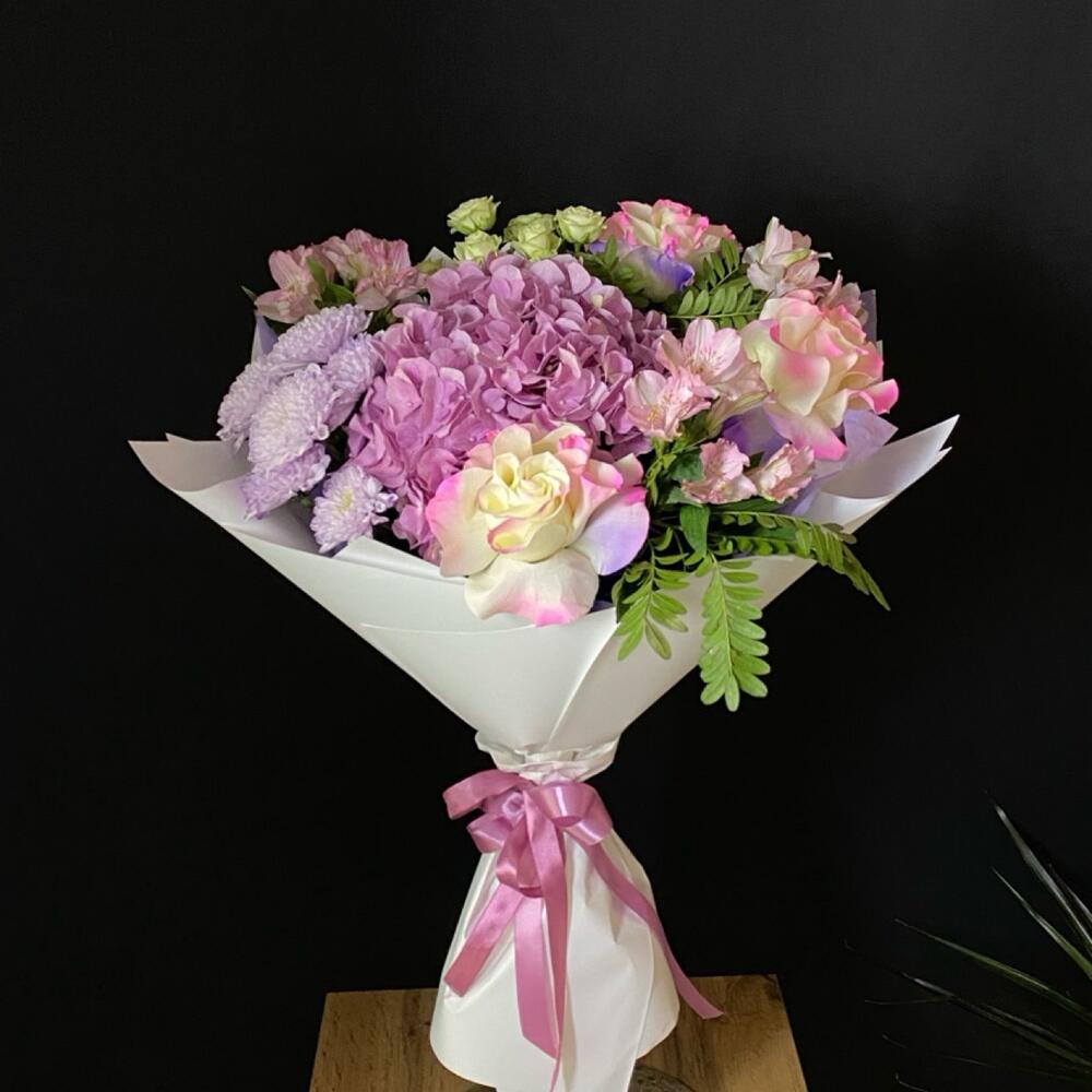 Альстроэмерия - 3 дана Гортензия - 1 дана Хризантема бұтасы - 1 дана Роза Эквадор - 3 дана Роза спрей - 1 дана Дизайн күңгірт пленка - 1 дана сіздің тілектеріңізбен ашық хат - 1 дана пимташка - 2 дана