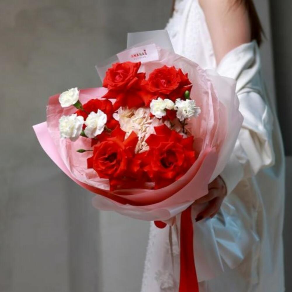 Гортензия - 1 дана Гвоздика кустовая - 2 дана Дизайнерлік қаптама - 1 дана Роза Эквадор 60 см - 5 дана