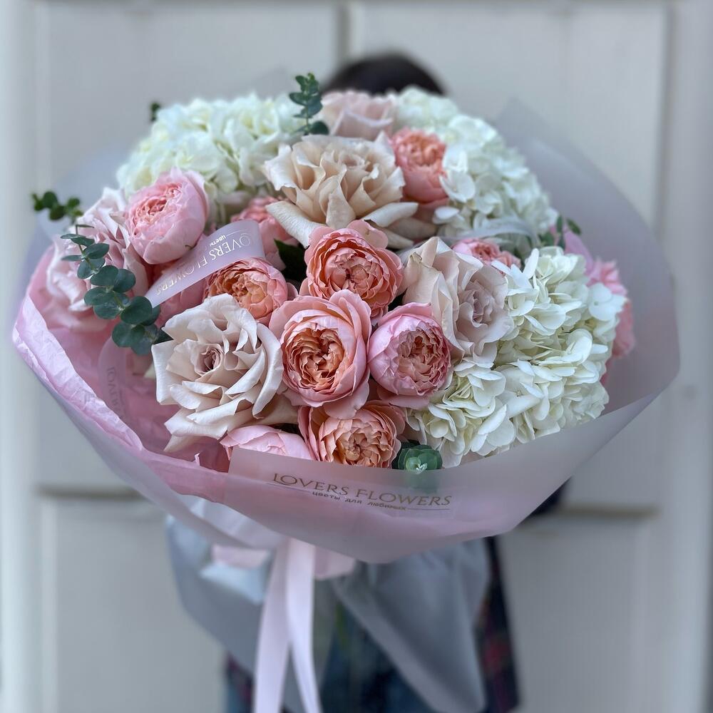 Гортензия - 3 дана Эвкалипт Baby Blue - 5 дана Дизайнерское оформление - 1 дана джульетта кустовая роза пионовидная - 7 дана квиксенд роза - 5 дана