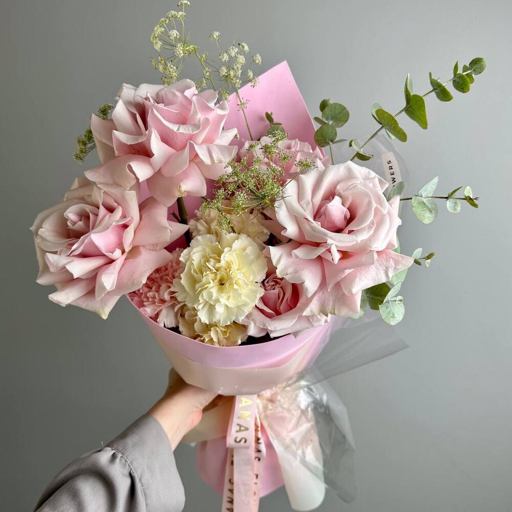 Амми - 3 дана Эвкалипт - 1 дана Роза Эквадор - 5 дана Диантус - 5 дана Дизайнерлік қаптама - 1 дана