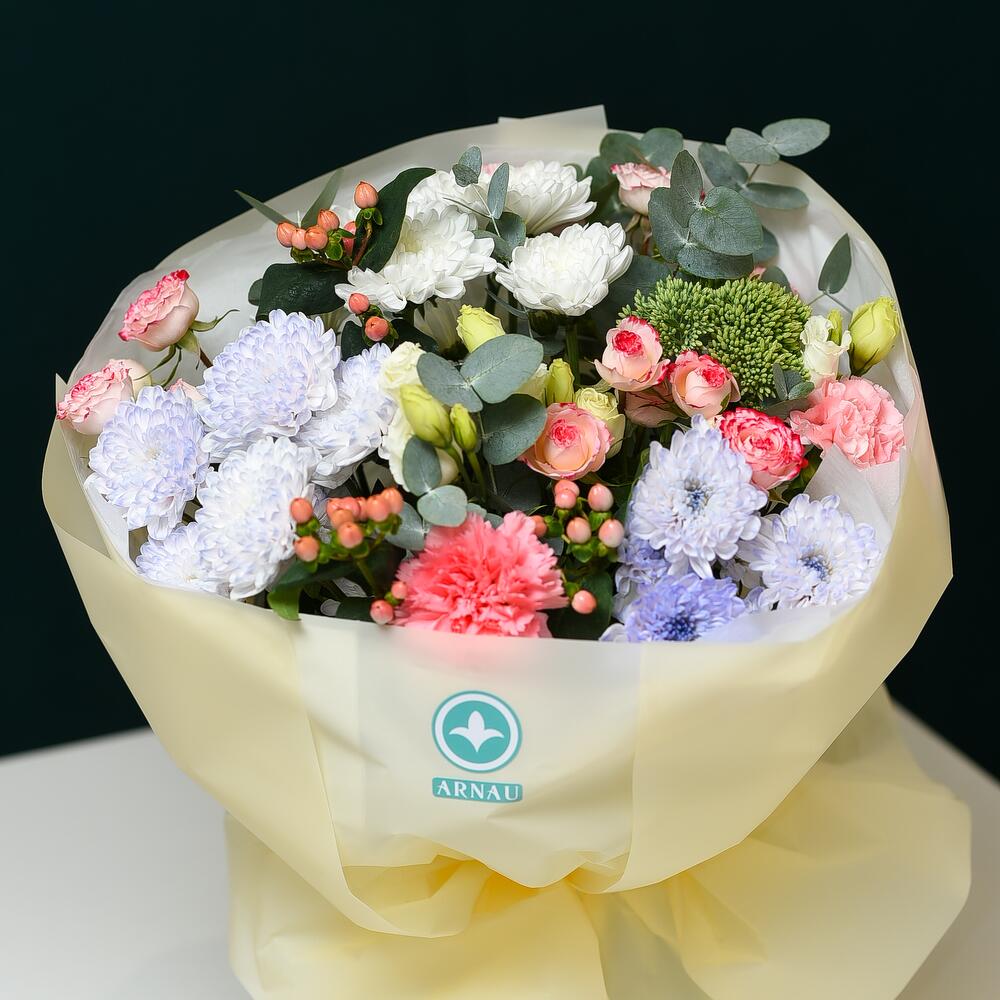 Гиперикум - 3 дана Эвкалипт - 3 дана Бұта раушаны - 3 дана Хризантема - 3 дана Орау - 1 дана Эустома - 2 дана Диантус - 2 дана