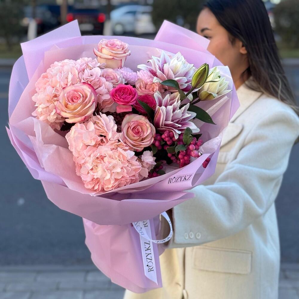 Гортензия - 2 дана Бұта раушаны - 1 дана Хризантема бұтасы - 1 дана Дизайнерлік қаптама - 5 дана Симфорикарпус - 1 дана Седум - 1 дана роза светло розовая - 5 дана