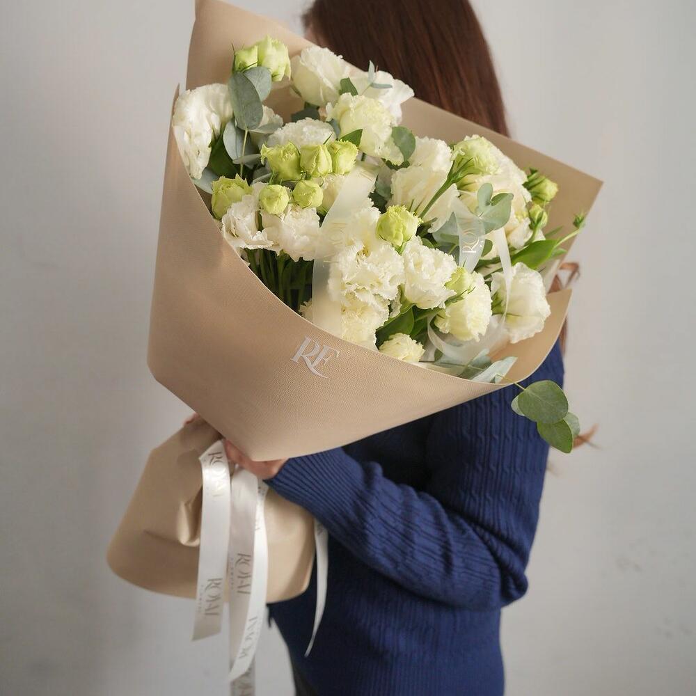 Минимализм, стиль и утончённость в одном букете. Белоснежные лизиантусы и свежая зелень собраны в элегантную упаковку натурального оттенка. Идеальный выбор для тех, кто ценит деликатность и вкус.