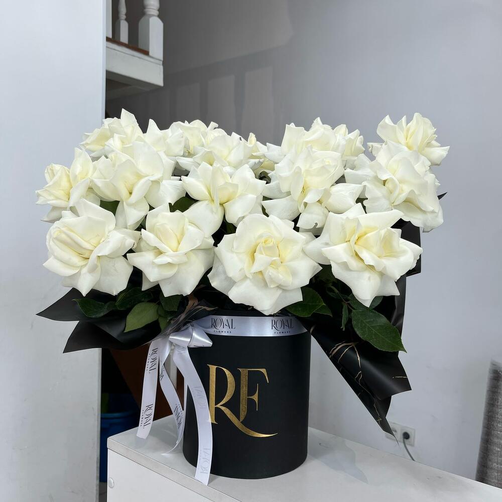 Элегантная композиция из белых роз в стильной коробке. Безупречный выбор для особого случая или знака внимания.