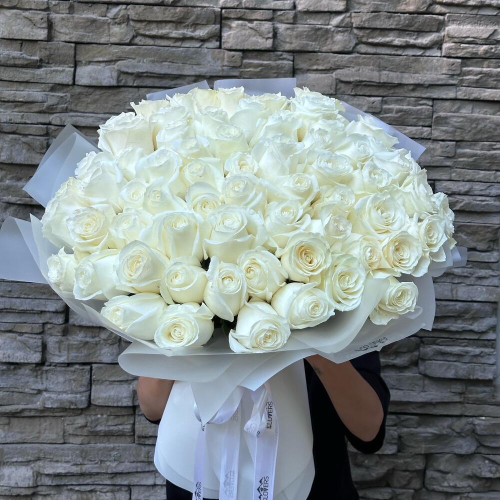 Шикарный и очень объемный букет собранный из идеально белых роз.