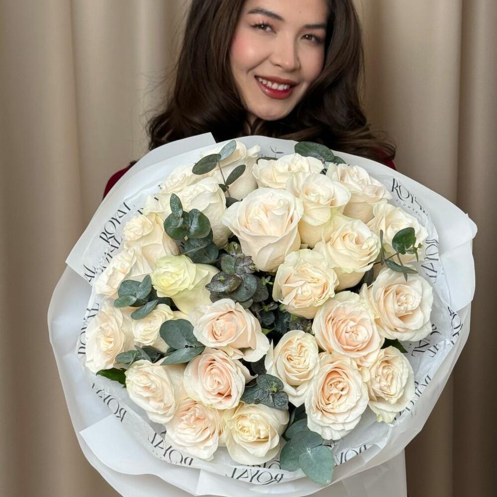 Изысканный букет из нежных белых роз с ароматным эвкалиптом.
