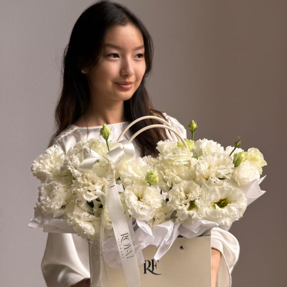 Композиция из воздушных белых эустом, украшенная лентами с логотипом Royal Flowers, оформленная в элегантную сумочку с ручками