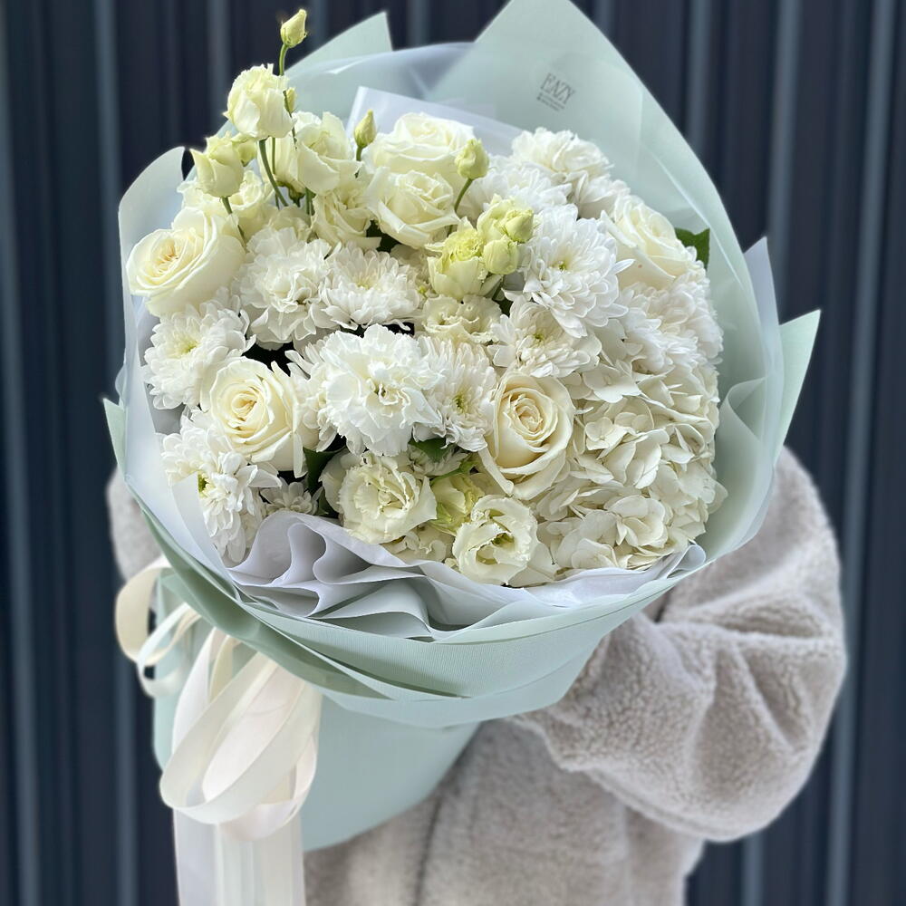 Гортензия - 1 дана Эустома - 5 дана Хризантема бұтасы - 2 дана Бір гүлді раушан - 5 дана Бір басты гвоздика - 3 дана
