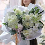 Гортензия - 1 дана Лизиантус - 3 дана Маттиола - 3 дана Хризантема бұтасы - 1 дана Эвкалипт - 5 дана Раушан - 3 дана Диантус - 3 дана Лилия Белая - 1 дана