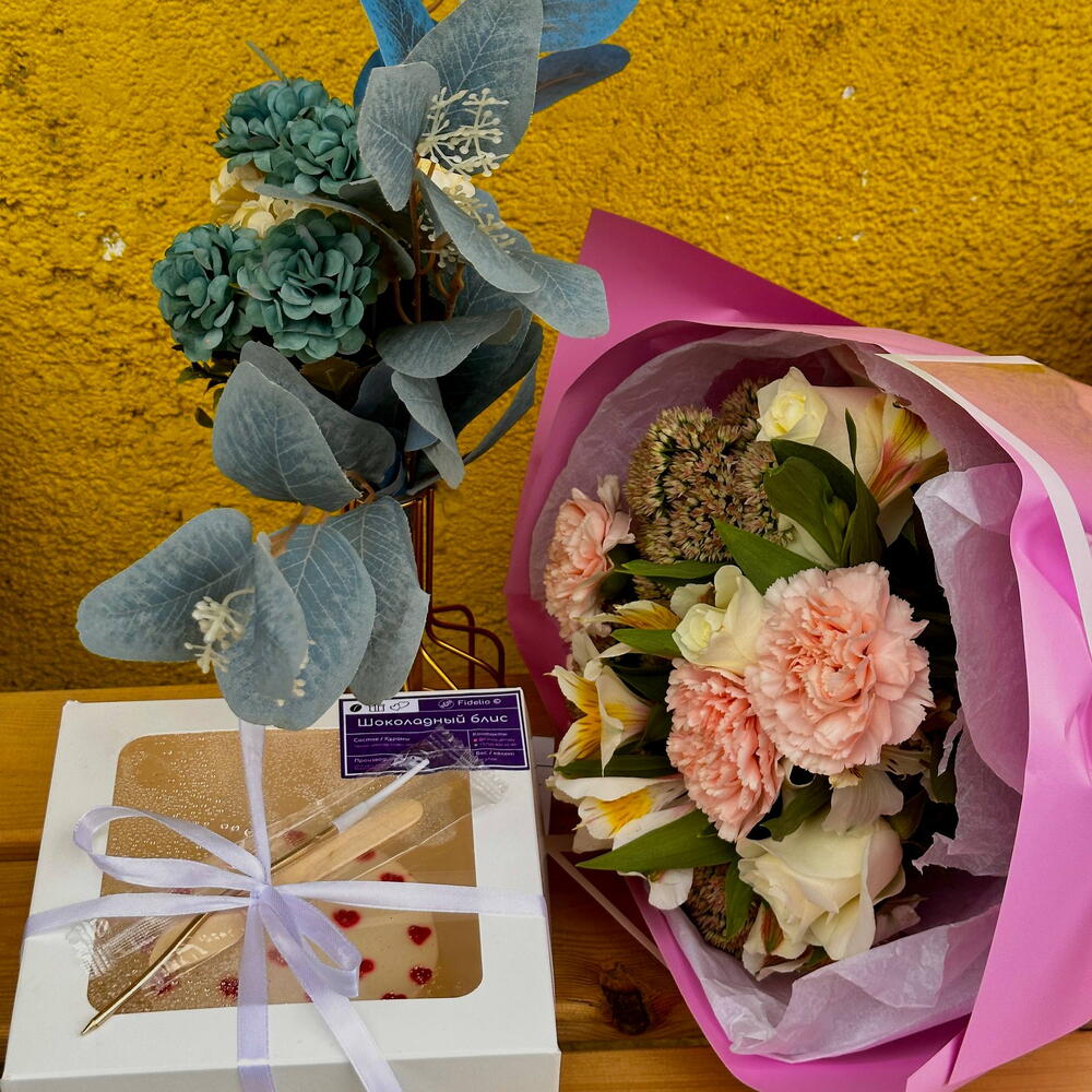 Нежный подарок для особого случая — бенто-тортик и букет свежих цветов. Мини-торт идеально подходит для душевного чаепития и личного поздравления. Букет из свежих сезонных цветов наполнит день яркими эмоциями.