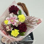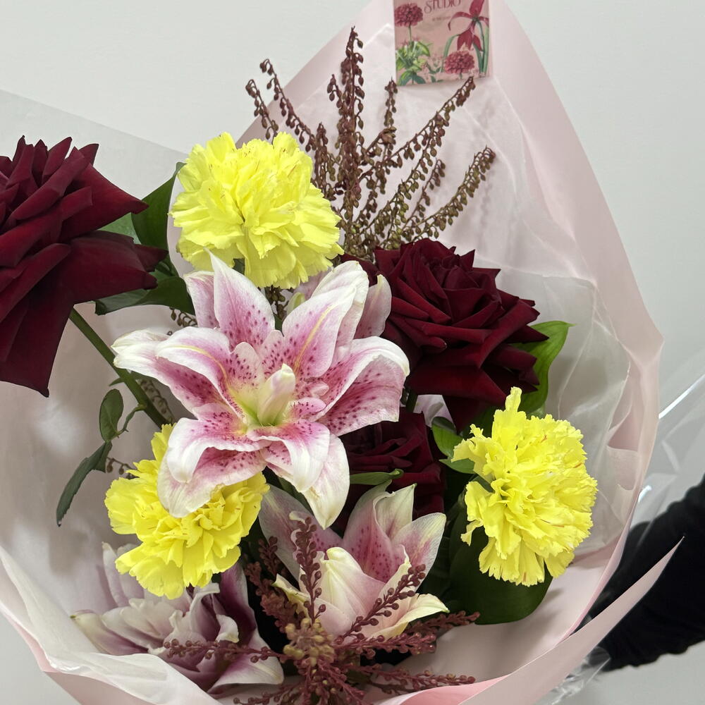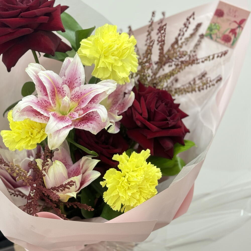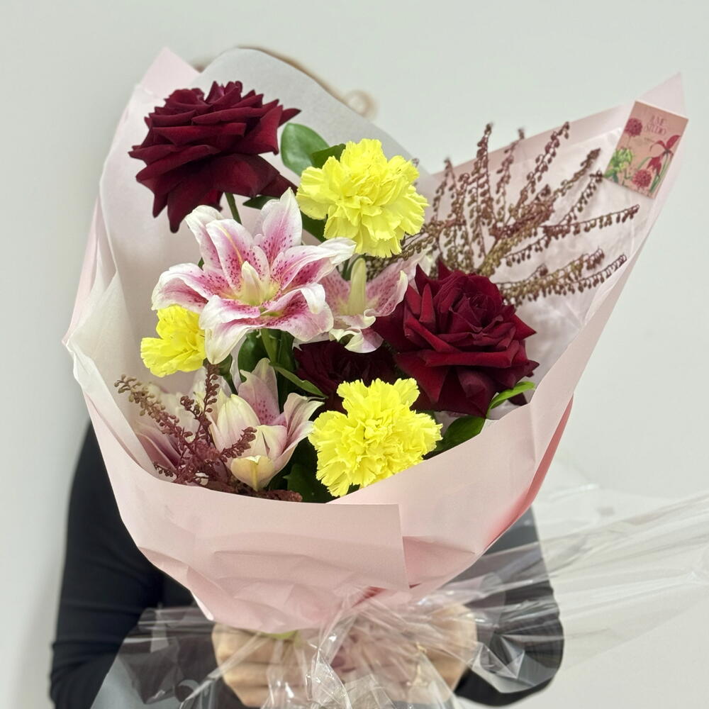 Жарқын, контрастты, мінезі бар букет 🌺 Құрамы: бордо түсті розалар, хош иісті қызғылт лилия және күн сәулелі сары гвоздикалар, текстуралы жасыл желекпен толықтырылған. Терең шарап түсті мен айқын лимон түстің үйлесімі әсерлі екпін береді — мұндай букет сөзсіз байқалады. Батыл сезімді білдіруге, туған күнге немесе «вау»-күй сыйлағыңыз келгенде жарайды. Стильді орамада рәсімдеп, кризал және күтім бойынша ұсыныстар бар карточка қосамыз 💌