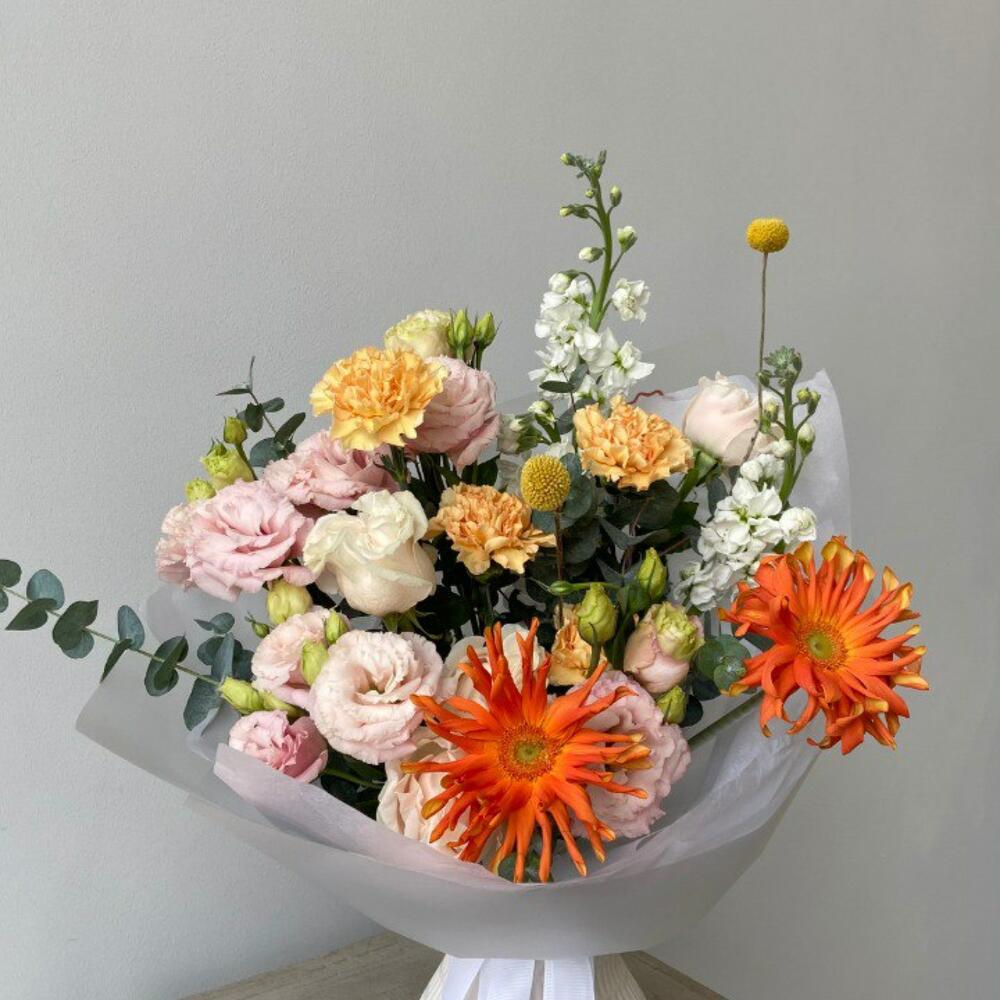 Краспедия - 2 дана Маттиола - 2 дана Эвкалипт - 1 дана Эустома - 3 дана Гербера - 2 дана Роза пионовидная - 3 дана