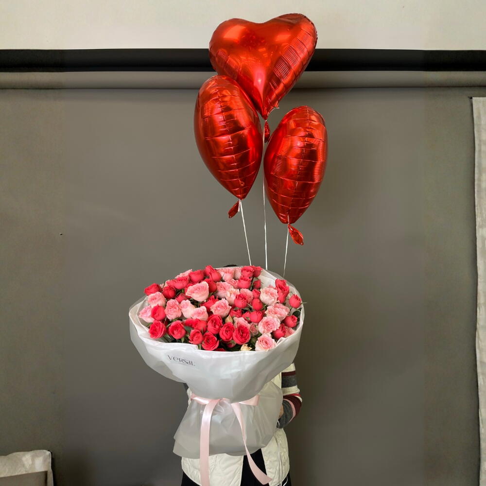 Екі түсті 19 бұтақты раушаннан тұратын букет және 3 жүрек пішінді шар