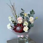Маттиола - 1 дана Протея - 1 дана Эвкалипт - 1 дана Гвоздика - 1 дана Эустома - 3 дана Ранункулюс - 1 дана ветка форзиции - 1 дана