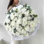 Букет из хризантем с эвкалиптом, который говорит больше, чем слова. Лёгкий, нежный и душевный — идеальный способ поделиться чувствами.