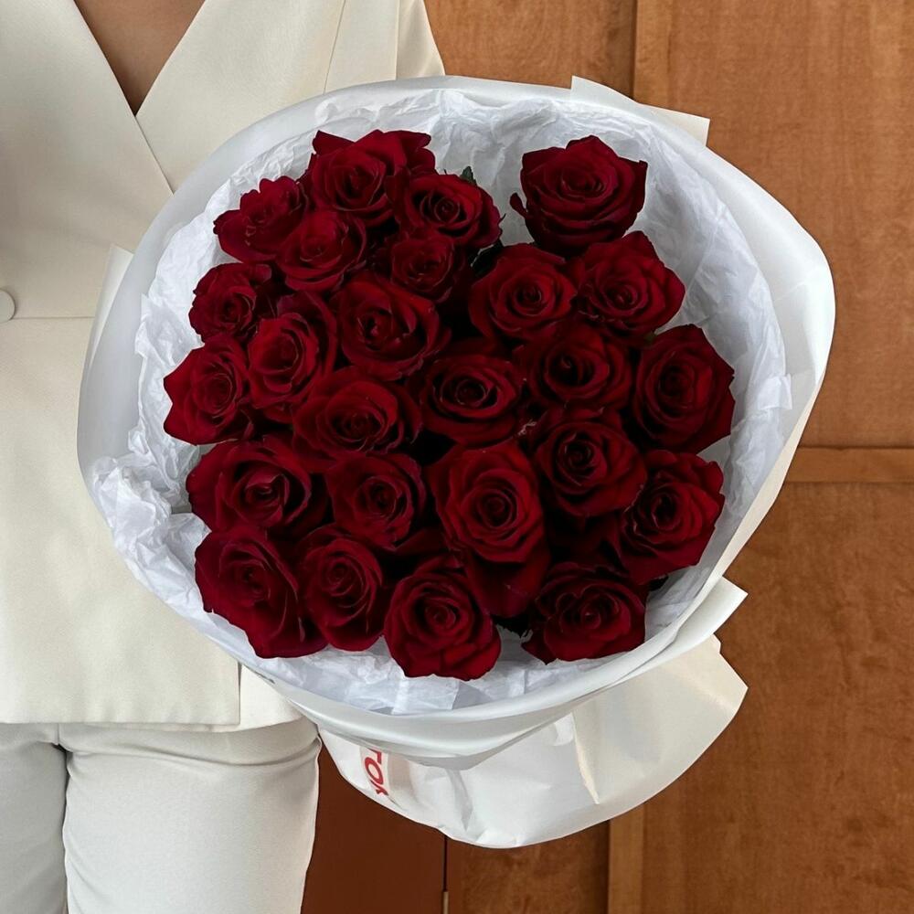 Букет из 25шт красных роз — маленькое произведение искусства. Идеален для подарка, который запомнится надолго