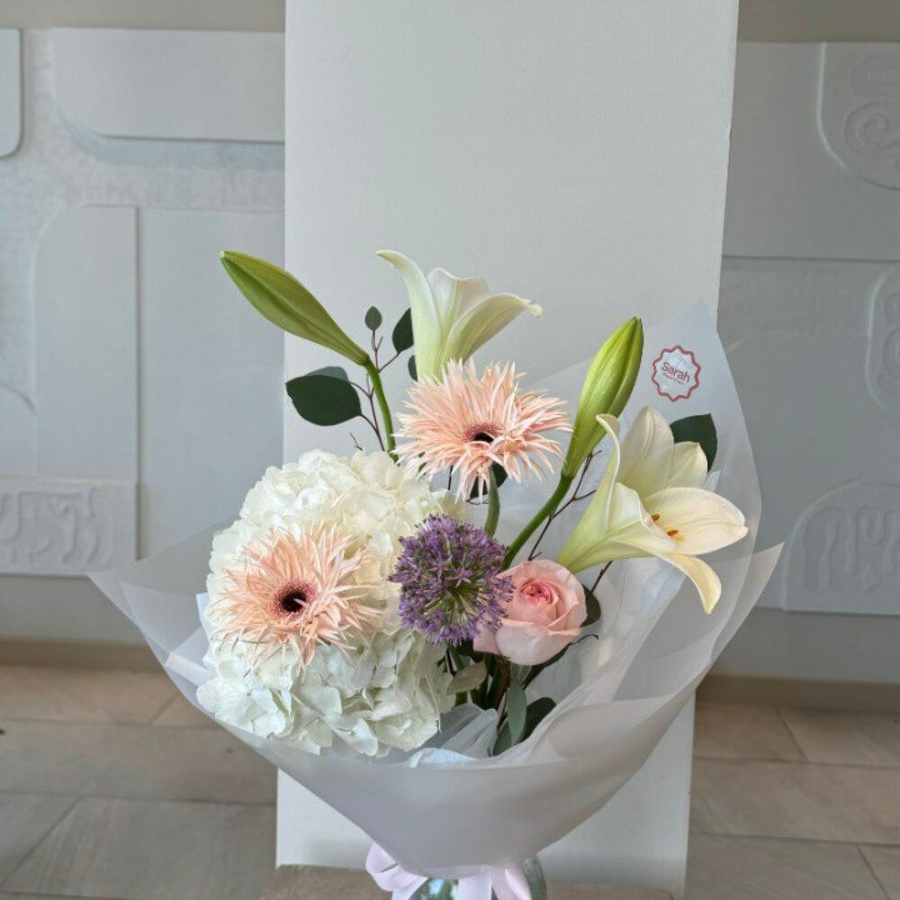 Гортензия - 1 дана Лилия - 2 дана Эвкалипт - 1 дана Гербера - 2 дана Пионовидная роза - 1 дана Аллиум Гладиатор - 1 дана
