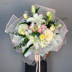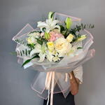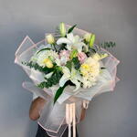 Альстроэмерия - 3 дана Гортензия - 1 дана Лилия - 3 дана Эвкалипт - 2 дана Раушан - 6 дана Роза пионовидная - 3 дана бумага тишью белая - 4 дана аква бумага полупрозрачная розовая - 4 дана лента репсовая светло-бежевая - 2 дана