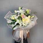 🌸 «Розовый Вальс» 🌸 Изысканный букет, где в танце нежности переплелись пышная гортензия, 3 изящные лилии, 3 пионовидные розы и 6 классических роз 🌹, дополненные альстромериями и веточками свежего эвкалипта 🌿. Оформленный в полупрозрачную розовую аква-бумагу с белоснежной тишью 💗 и перевязанный светло-бежевыми репсовыми лентами 🎀 — этот букет словно лёгкая мелодия, которая тронет сердце. 💐 Дарите красоту, которая говорит без слов.