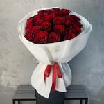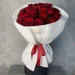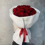 Қызыл раушан - 25 дана ақ фоамиран - 4 дана ақ тишью қағазы - 4 дана қызыл репс лента - 1 дана